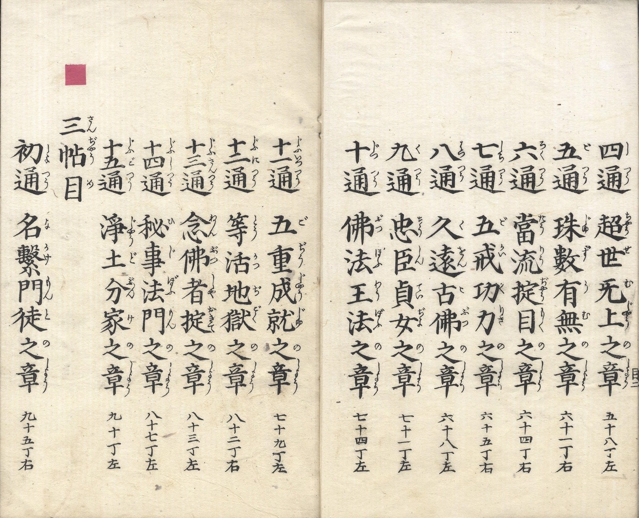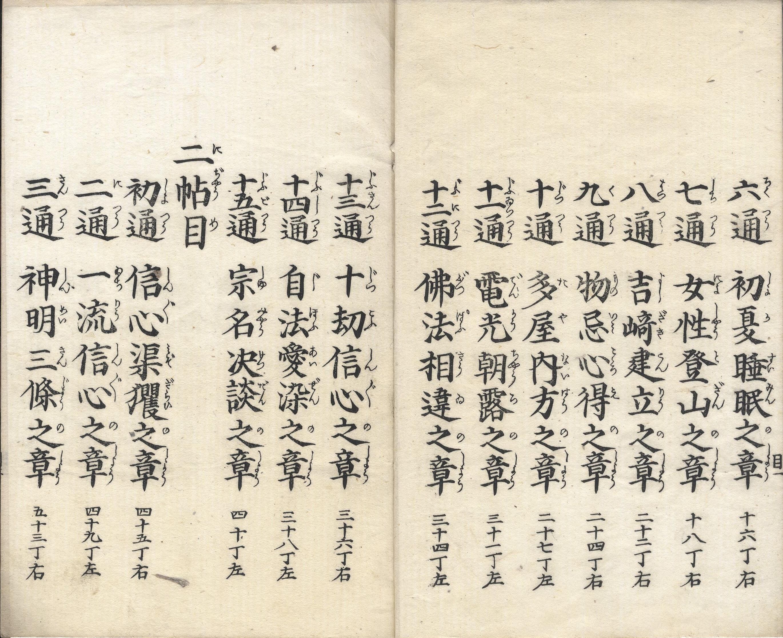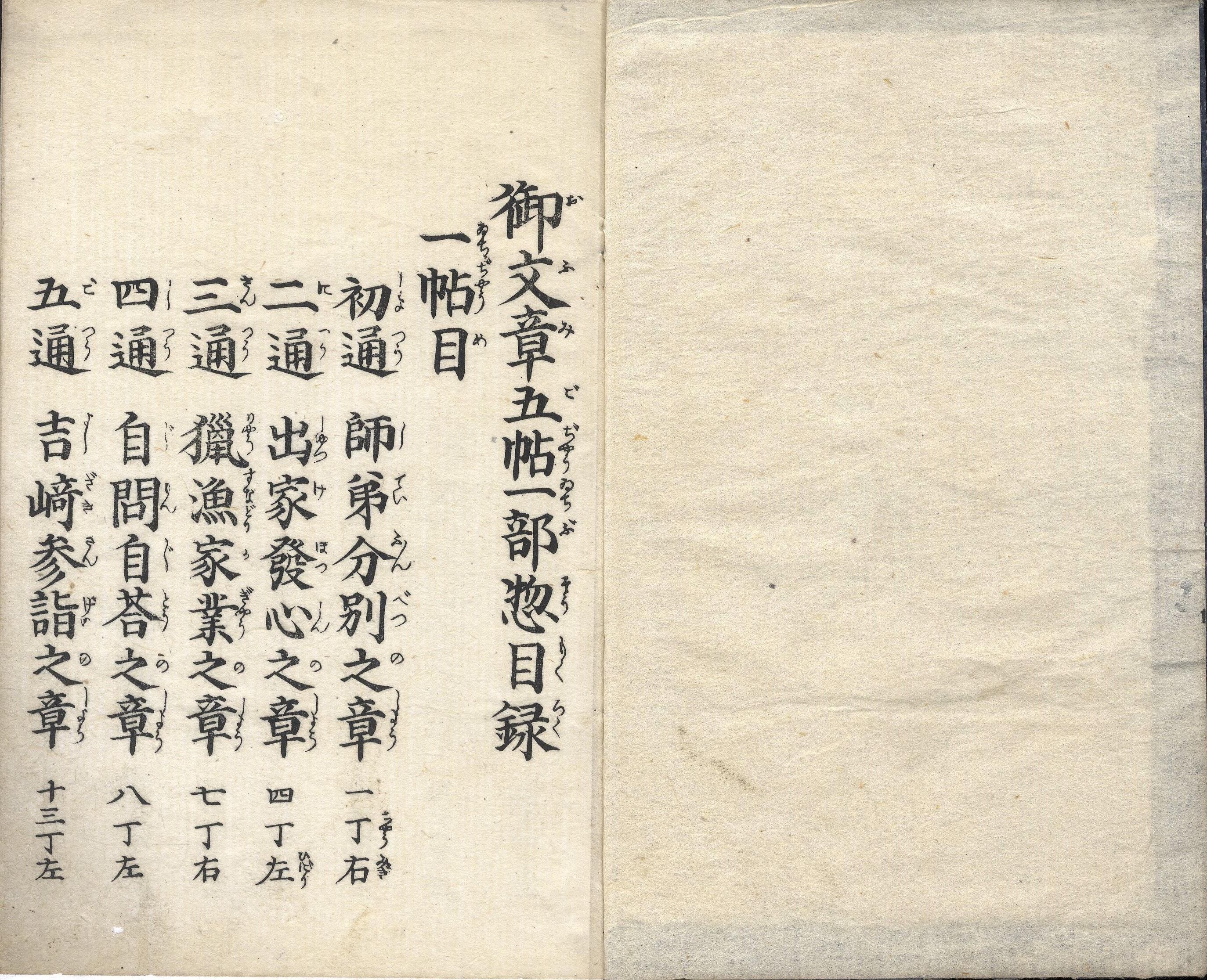 【判型】中本2巻2冊。縦189粍。【作者】蓮如(兼寿)作。円如(光融)編。【年代等】明治初年刊。[東京]玉養堂板。【備考】分類「真宗」。『御文章』は、文明3年(1471)から明応8年(1499)までの書。5巻。真宗本願寺の8世蓮如が信徒のために、書簡文の形式で真宗の教義を説き示したもの。今日のいわゆる文書伝道の先駆をなすものである。蓮如が真宗の中興の祖と称せられ、その一代に真宗に勃興したのには、この文章の製作頒布が大きな力となったといえる。文の名称はこのほかに「御文」「宝章」「勧文」「勧章」などがある。研究書に慧琳「記事珠」6巻、道隠「明燈鈔」15巻など(「日本思想史文献解題」参照)。SE02910