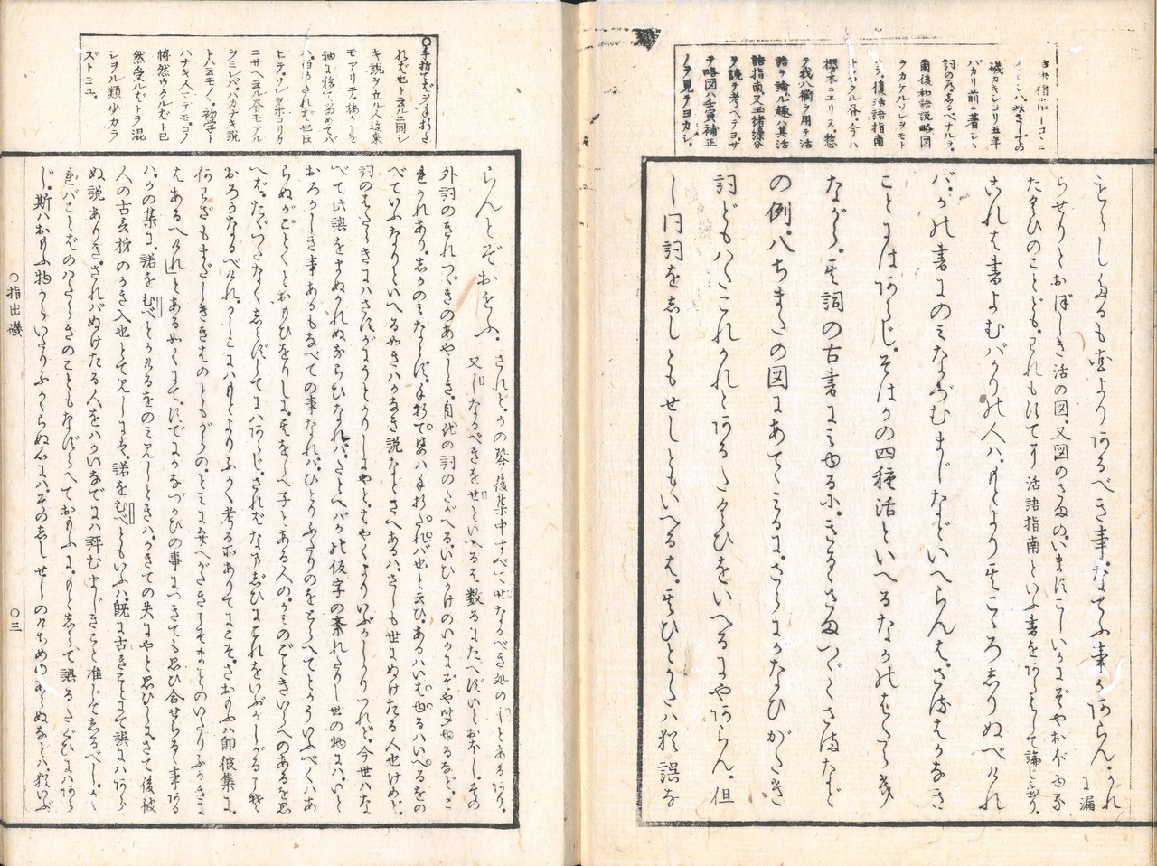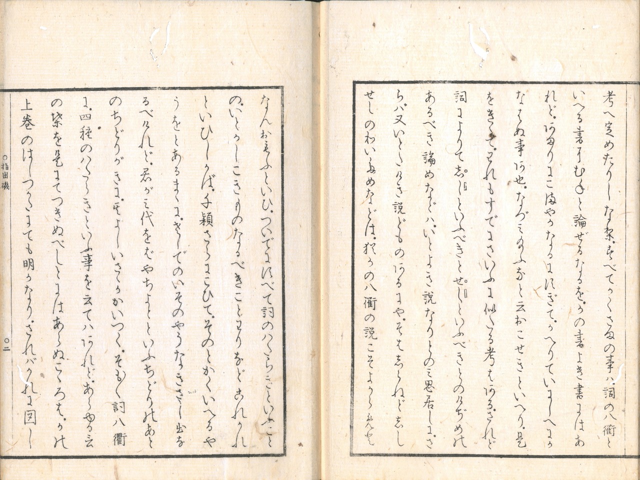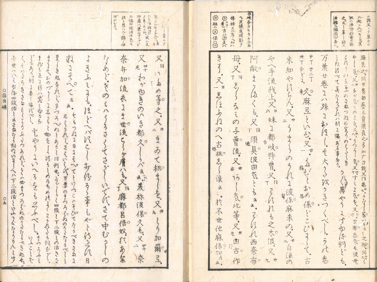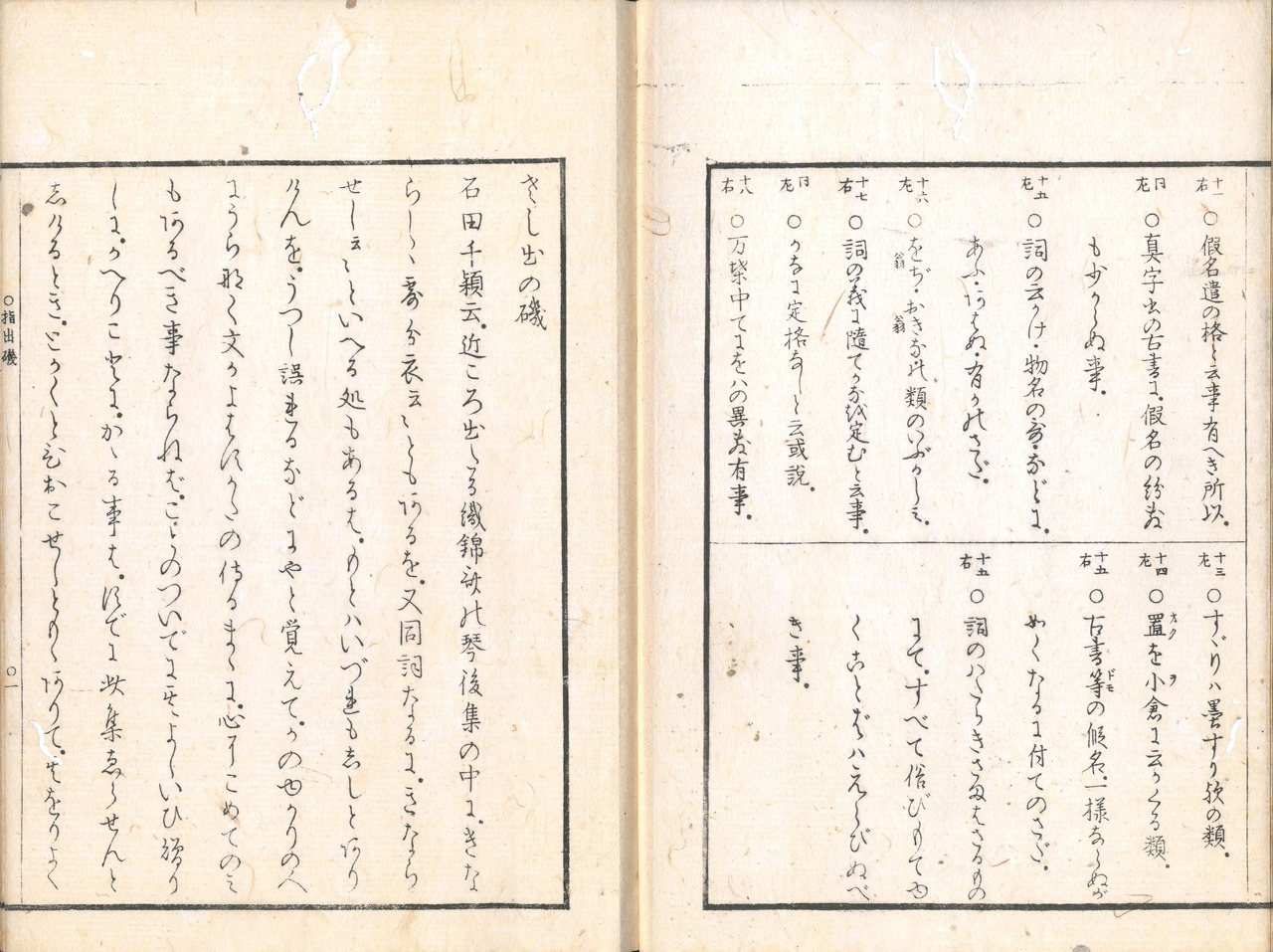 【年代等】指出廼磯:文化12年4月脱稿。天保12年校訂(施注)。磯乃洲崎:天保12年9月作。文政3年10月、本居大平序。天保13年3月、本居内遠序。天保14年8月刊。白雲城下白雪楼蔵板。[大阪]河内屋茂兵衛ほか売出。