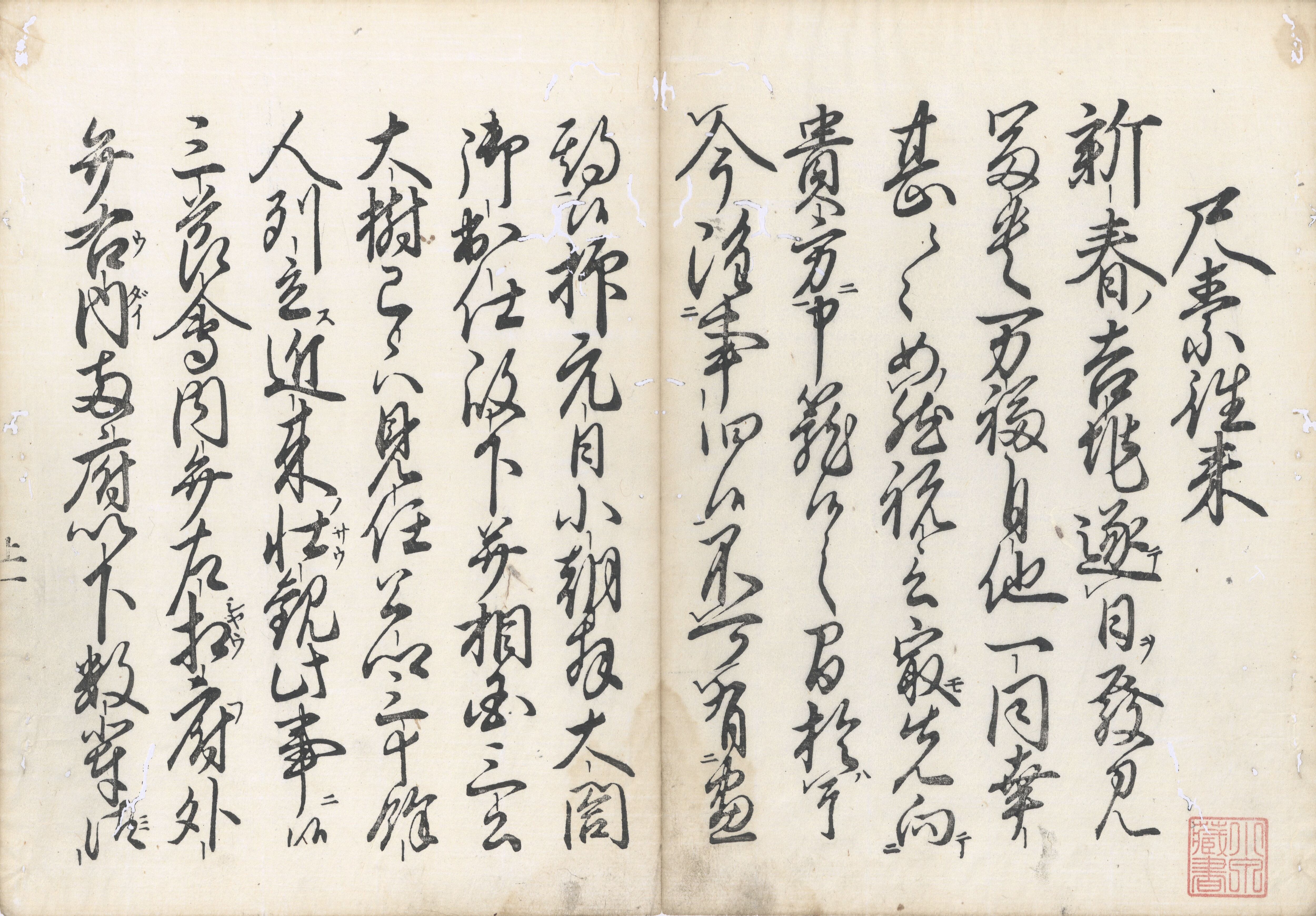 【備考】分類「往来物」。同板2種を全冊袋綴じ展開収録。底本のうち最古本と思われる安田板は、住所から寛永~明暦頃の刊行と思われる。『尺素往来』は、古写本は長享3年(1489)書で、現存本では大永2年(1522)写本(橋本公夏筆。内閣文庫蔵)が最古本。古刊本は寛永~明暦頃刊と思われる無刊年本と寛文8年(1668)板の2様あり、前者は安田十兵衛板(後に[京都]山岡市兵衛ほか板あり)、後者には[大阪]和泉屋卯兵衛板、[大阪]紀伊国屋宇兵衛板、[大阪]田原屋平兵衛板、[京都]石田治兵衛板、[京都]村上三郎兵衛板等がある。室町時代中期、永享12年(1440)より寛正5年(1468)に至る25年間に作られたと推測される古往来で、南北朝時代に成立した『新札往来』に大幅な増補を加えたもの。上下両巻合わせて1通の新年状形式をとり、その間に60条目(上巻25条、下巻35条)もの豊富な語彙集団、すなわち、神祇30語、仏教241語、漢学63語、文学100語、教養185語、人倫12語、職分職業38語、衣食住455語、武具64語、自然13語、その他75語の合計1276語を収録する。この語彙数は、室町後期『新撰類聚往来』に次いで多く、そのうち3分の1以上を占める455語が衣食住の生活関係語彙である点が注目される。また、江戸初期刊本に2様あり、寛文8年刊本(武藤某筆)は本文を大字・5行・稀に付訓、江戸前期・無刊年本(安田十兵衛板系統)は大字・6行・稀に付訓で記す。SE03003