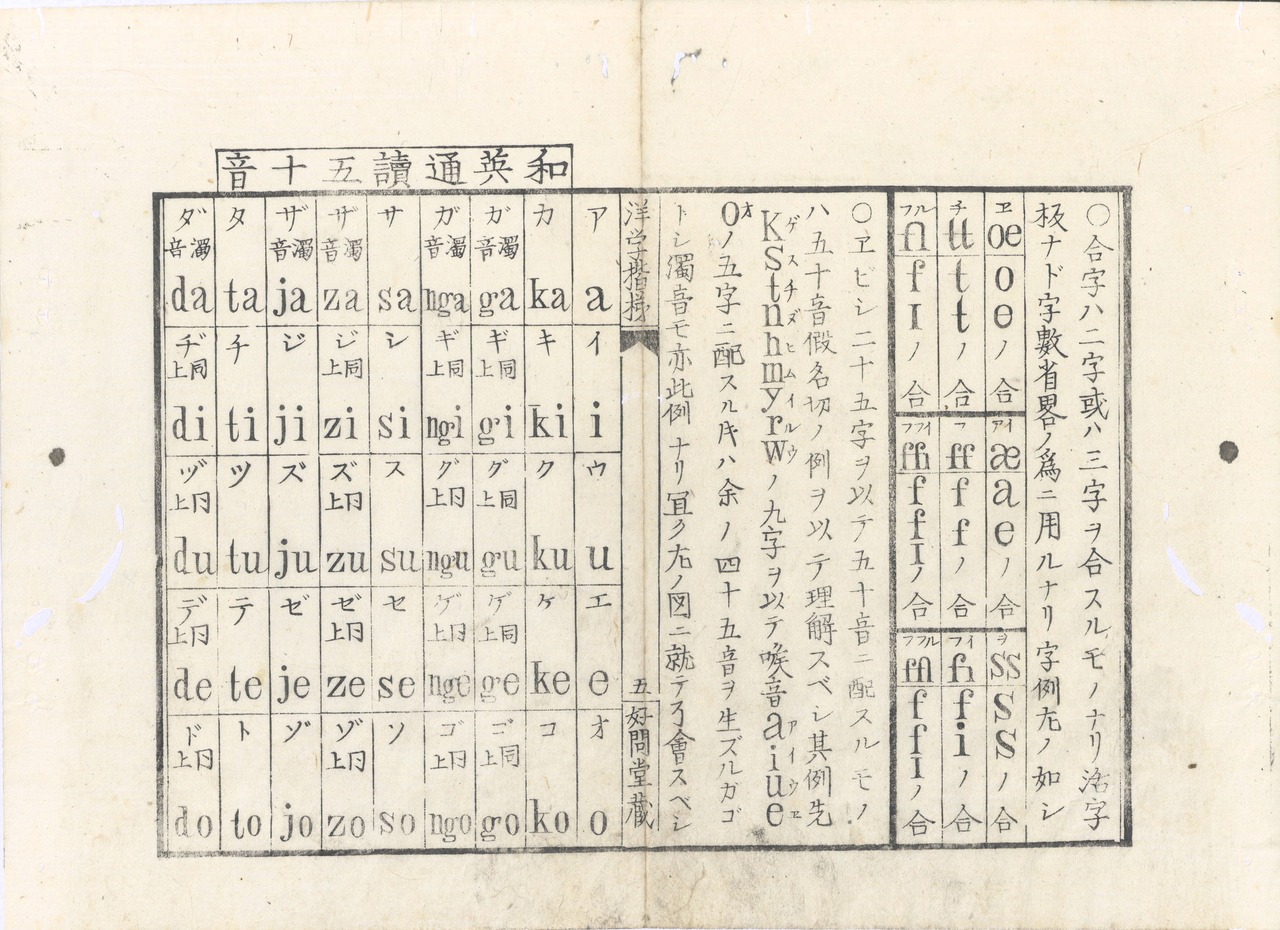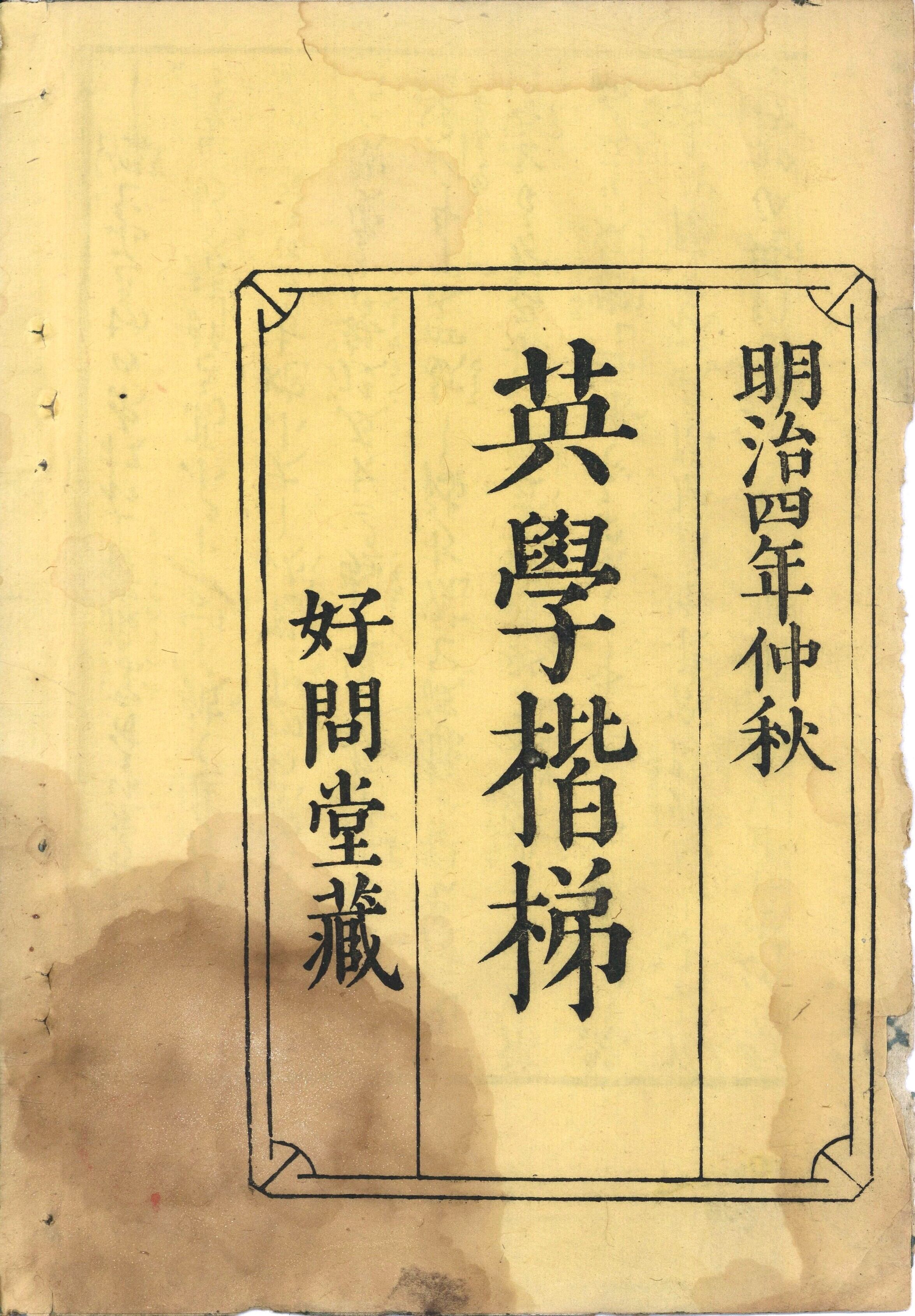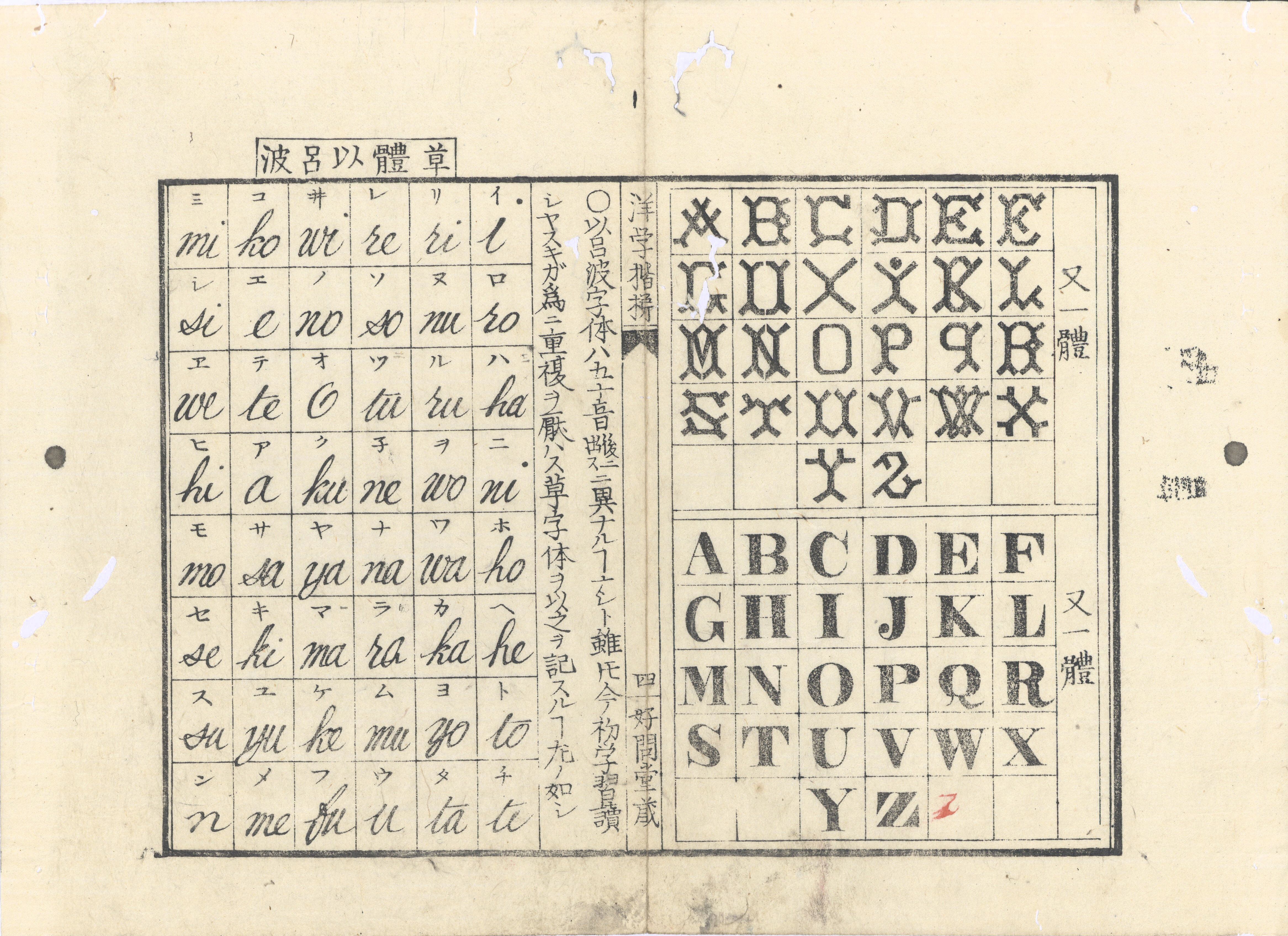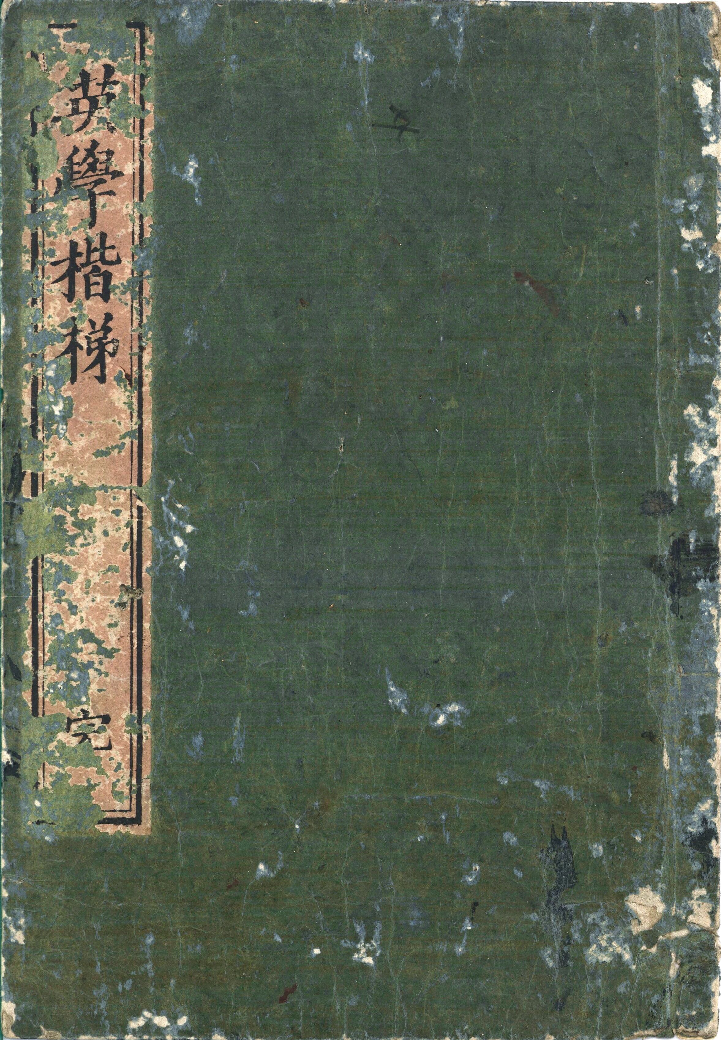 【備考】分類「往来物・外国語」。同板2種を全冊袋綴じ展開収録(見開き図再掲)した。『英学楷梯[洋学楷梯]』は、英学を学ぶ者の初歩知識である、英語の「字体」「連続語法」の大要を略記した教科書。まず「字体」、すなわちアルファベットの26文字のローマン体・イタリック体の大字・小字について述べ、「ヱビシ(ABC)二十六字音訳(ヨミカタ)」を片仮名と漢字で「唖(ヱー)・口美(ビー)・施(シー)…」のように列記した後、ローマン体大字・同小字・イタリック体の小字・同大字の順にアルファベット表を掲げ、別に2種類の字体も載せる。続いて筆記体の英字で綴った「草体以呂波」、ローマ字の合字、五十音表に対応させた「和英通読五十音」、連続子音のあらまし、固有名詞冒頭の大文字表記、コロン・セミコロン等の約物を解説した「語学記号」、商取引で多用する主な通貨・度量衡単位の「商家記号」、加減乗除・分数・数字等の「数学記号」、英文を綴るための「言辞八品(名詞・動詞・形容詞・代名詞・副詞・前詞・接続詞・間投詞)」、さらに基本的な単語・短文を多数掲げて読みと意味を付す。SE03012"