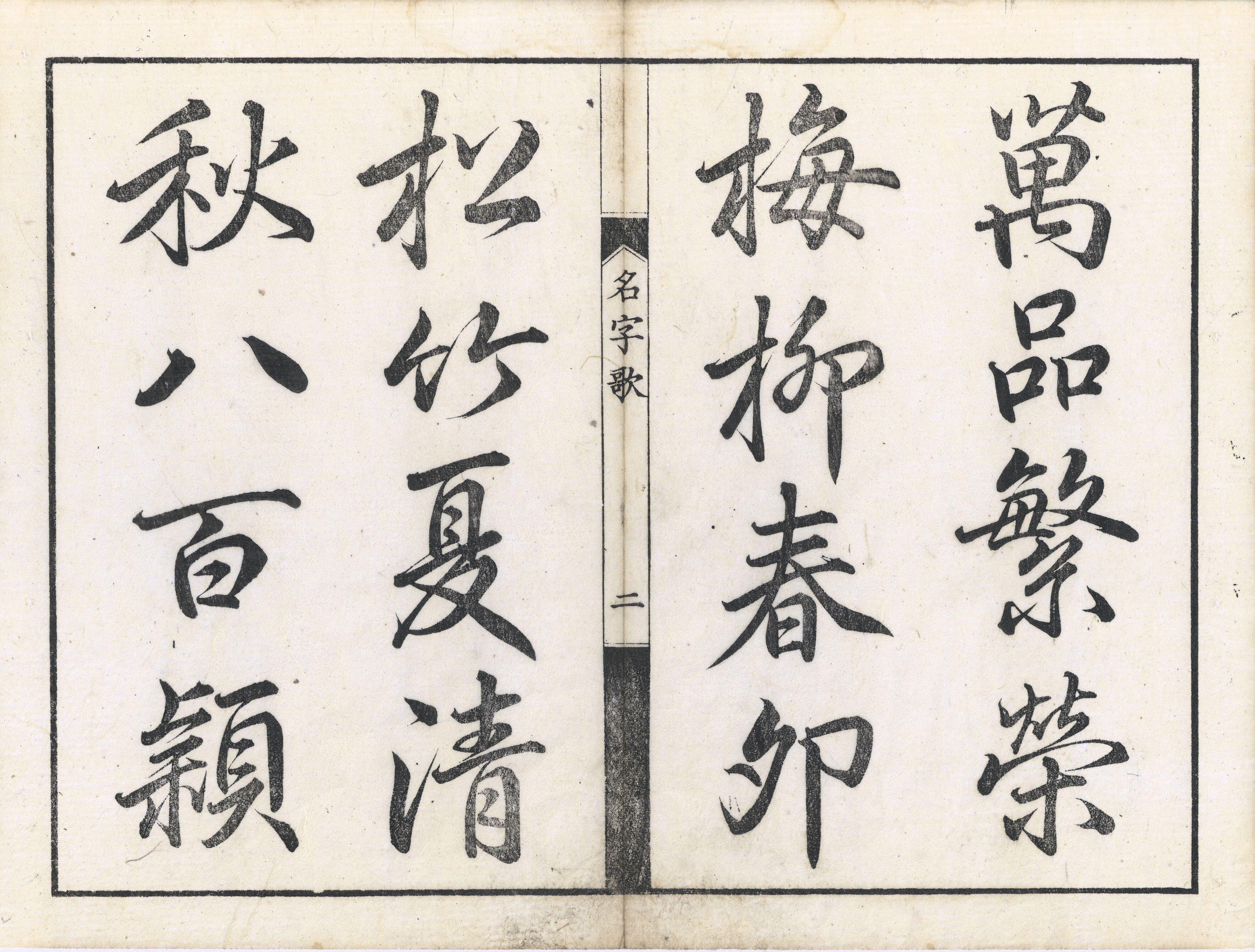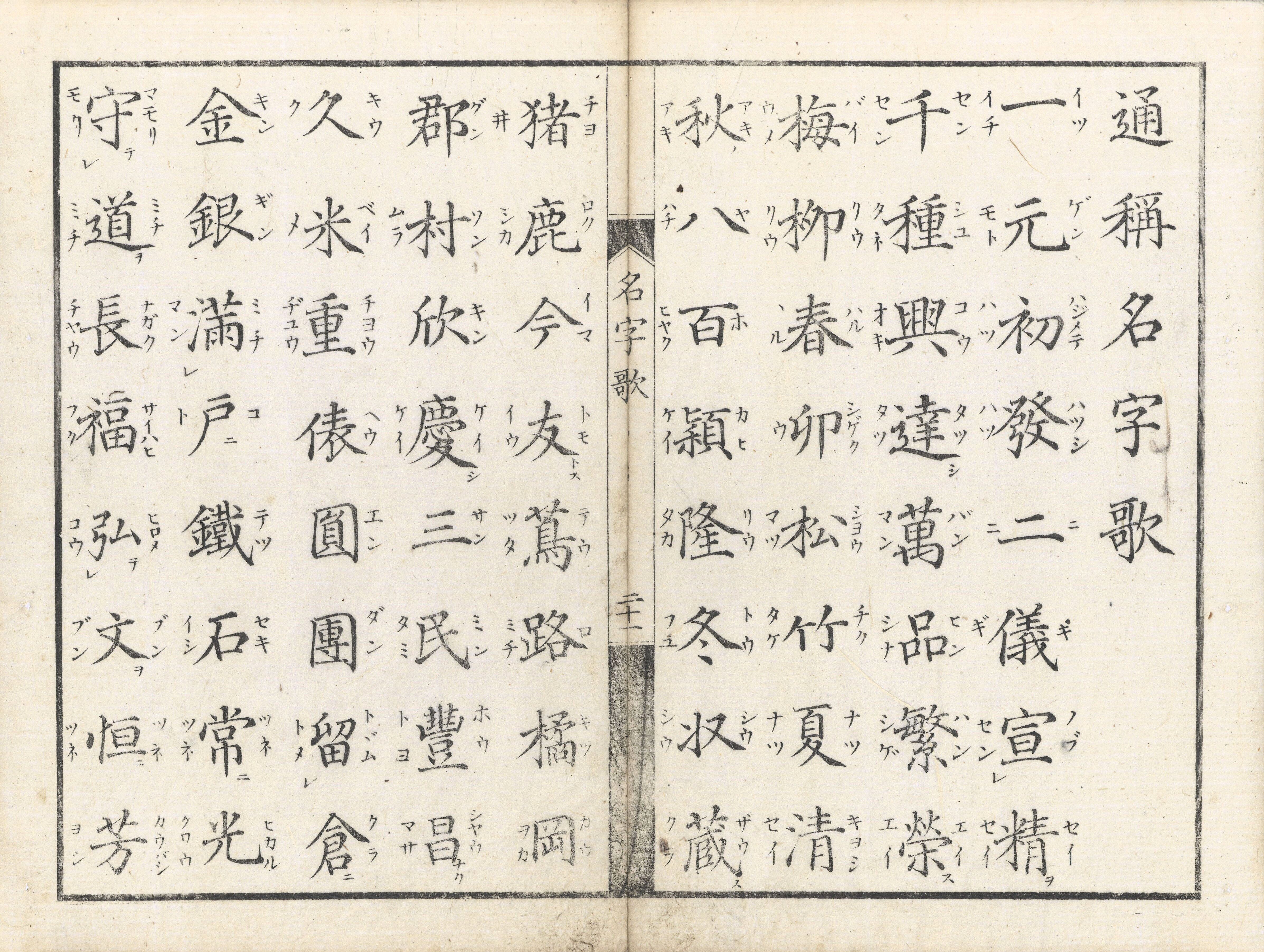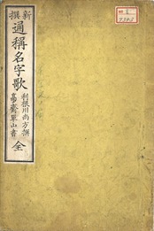 【備考】分類「往来物」。袋綴じ展開収録。『〈新撰〉通称名字歌』は、文字通り、明治初年における通称・名字用の漢字を集めて意味の通った文章にした往来で、漢字4字1句、2句1聯の『千文字』形式で綴る。「一元初発、二儀宣精。千種興達、万品繁栄…」から「…全国半郷、勘辨賢哲、耕助広荒、嘉辰皆悦」までの全76句・304字から成る。同字でも読みが違う場合には重複して掲げたり、文字数が1000字よりはるかに少ない点で『千字文』と異なる。いわば近世後期の『名頭字尽』の内容を一新して『千字文』形式で再編成したもの。本文を行書・2行(1行4字)・無訓の手本用に認め、巻末に楷書・5行(1行8字)・付訓(両点)の本文を再録する。SE03028
