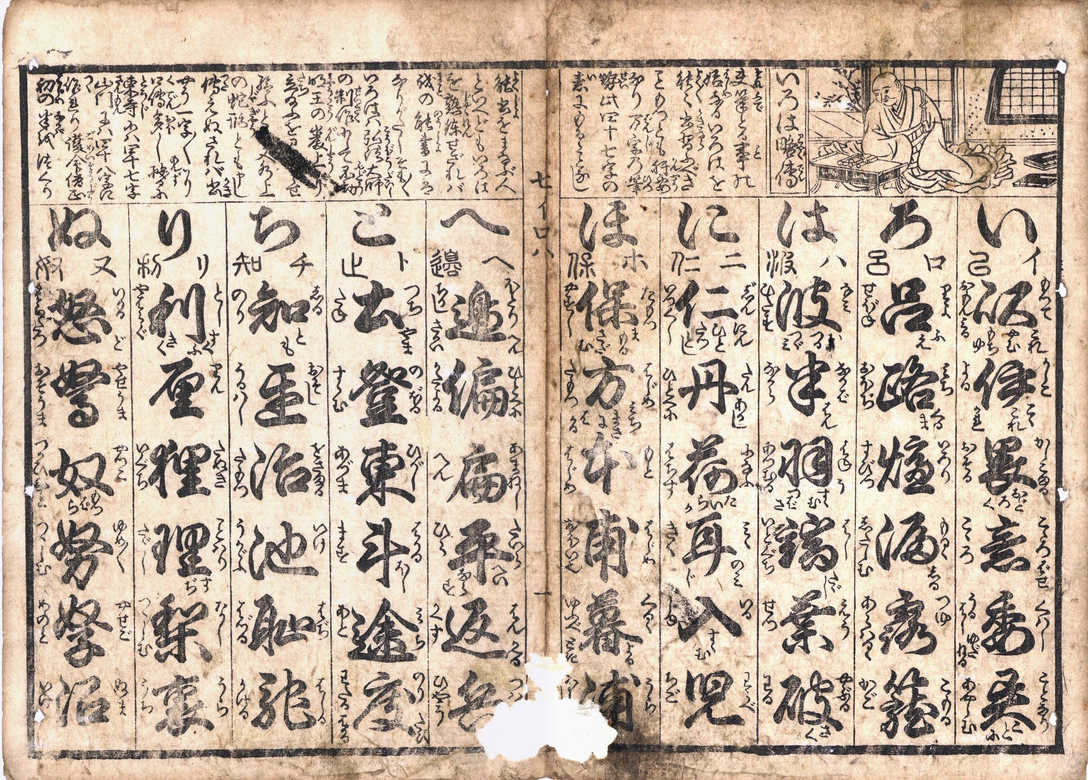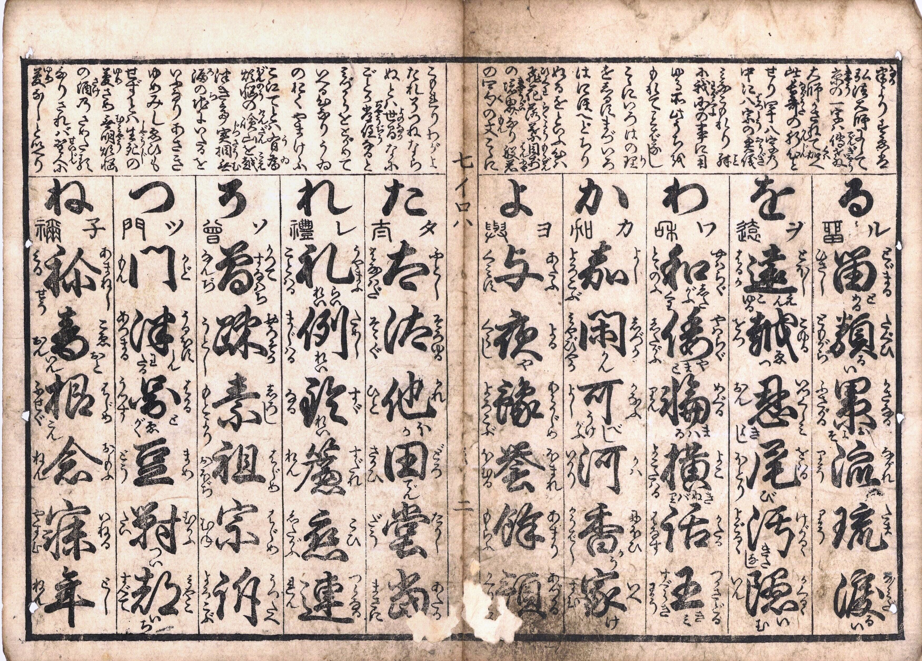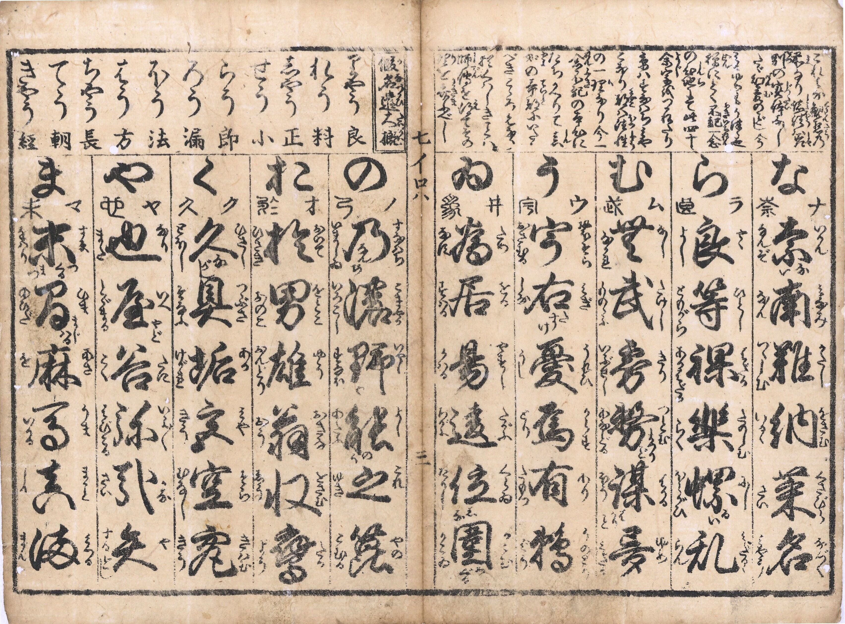 【備考】分類「往来物」。文化板・天保板の3種を全冊袋綴じ展開収録。『〈文化新板・鶴寿〉七ッいろは[七箇伊呂波]』は、「七ッいろは」に種々の付録記事を添えた往来物。「七ッいろは」は、見出しを兼ねる冒頭の漢字(大字・篆書で記し小字の平仮名と片仮名を付す)1字と、同音の漢字(大字・行書で記し、音訓を平仮名で付す)6字の計7字を1行に記したもので、「イ」~「京」に続けて「一」~「十」も同体裁で綴る。続けて「十干・十二支」「偏傍冠構尽」を付す。見返に「涅槃経・四句偈」と「空海・天満宮略伝」を掲げ、頭書に「いろは略伝」「仮名遣大概」「国づくし」を載せ、巻末に「十二月異名十二支」「五性名頭字」を収録する。なお、後印本では見返や後付に異同がある。また、底本末尾の1本は裏表紙に弘化5年の書き入れがある。SE03041