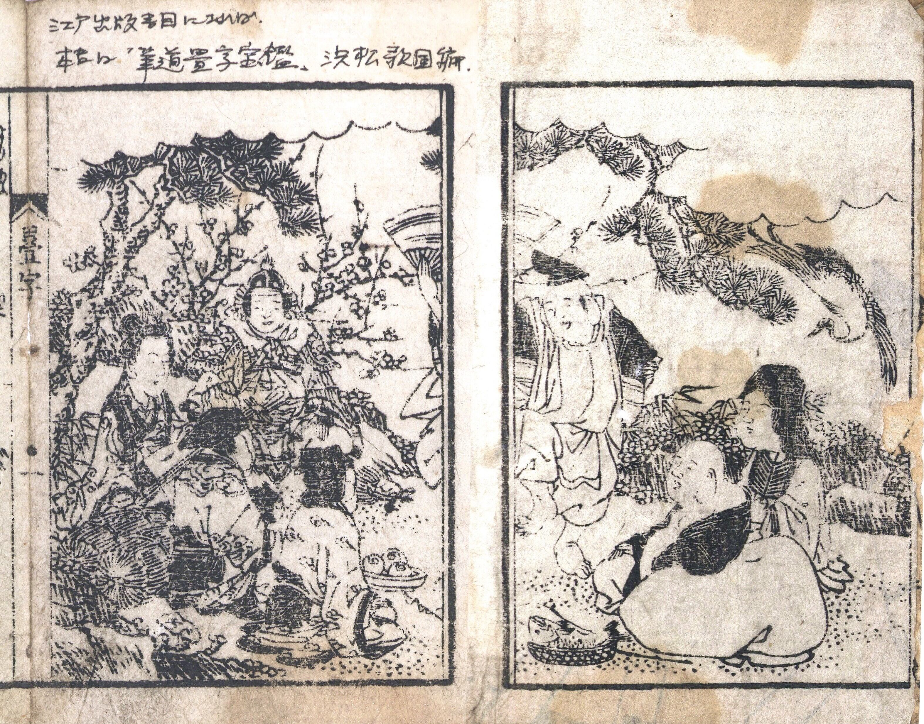 【備考】分類「往来物」。袋綴じ展開収録(見開き図再掲)。書名および作者名は『江戸出版書目』による。『筆道畳字宝鑑[畳字宝鑑]』は、日用の2字熟語をイロハ順に集めた往来物。「幾世、引率、引導、引接、引級、引挙、揖譲、猶予…」以下各行4語、半丁5行・付訓で合計1576語(うち1語は「言語道断」の4字熟語)を収録する。巻頭口絵に「七福神図」を掲げ、前付に「寄合てよき人・悪しき人・にくまるゝ人・思はるゝ人・物になる人・物にならざる人」「象形文字」「天神教訓状」「三体以呂波」「小野篁歌字尽略」「篇冠構尽」「書札したゝめ様の事」「五性書判」「五性名がしら」「行成卿入筆伝授」を、また頭書には「世話用字〈唐人のことば〉」「文字のはじまり」「日本三筆」「本朝三蹟」「扇に詩歌書やう」「色紙たん冊の書法」「笈入物書やう」「歌書の書やう」「物の数書やうの事」「男女相性」「十幹十二支」「月の異名」を載せる。また、後付に「本朝近代三筆」「十二支・十幹」を付す。SE03045