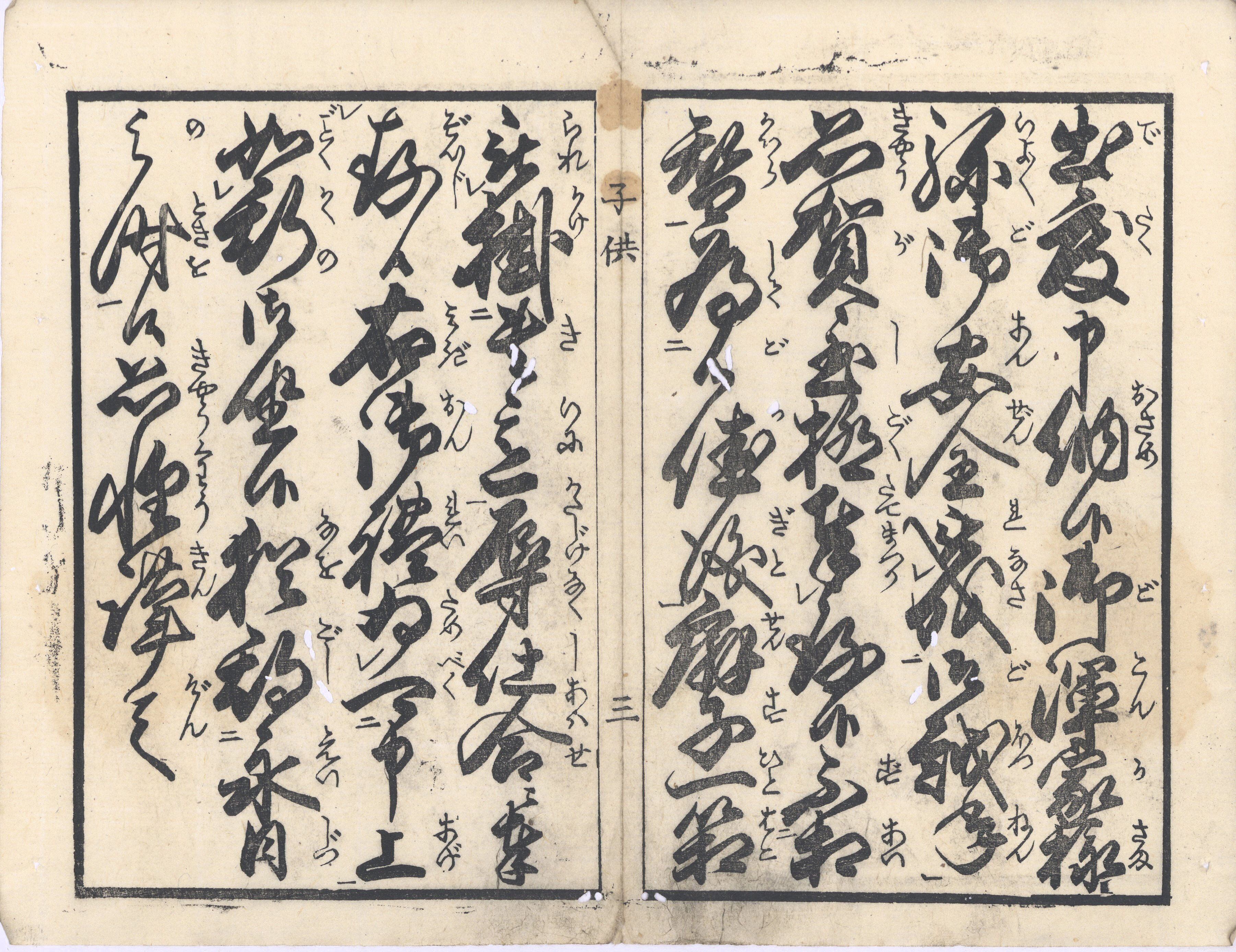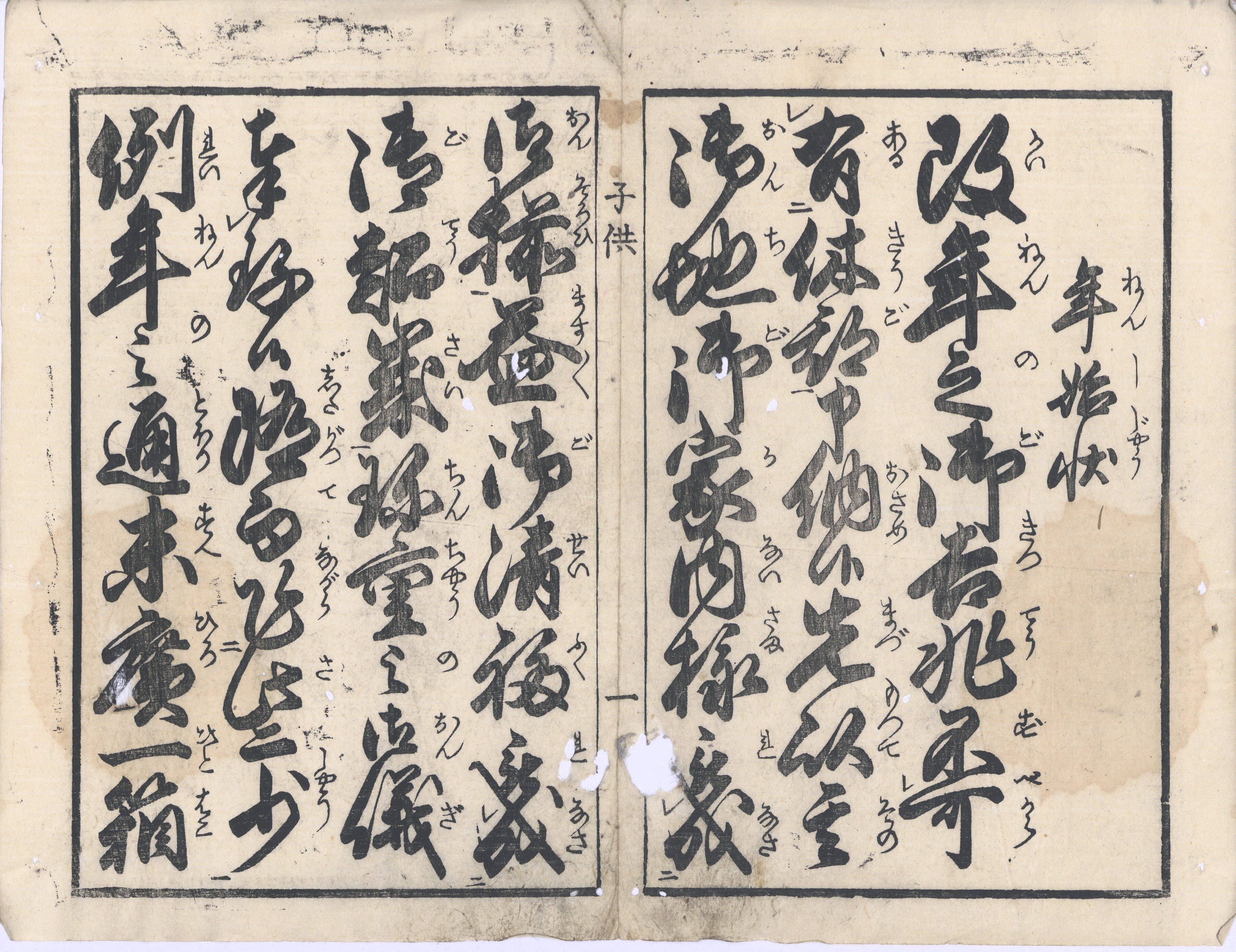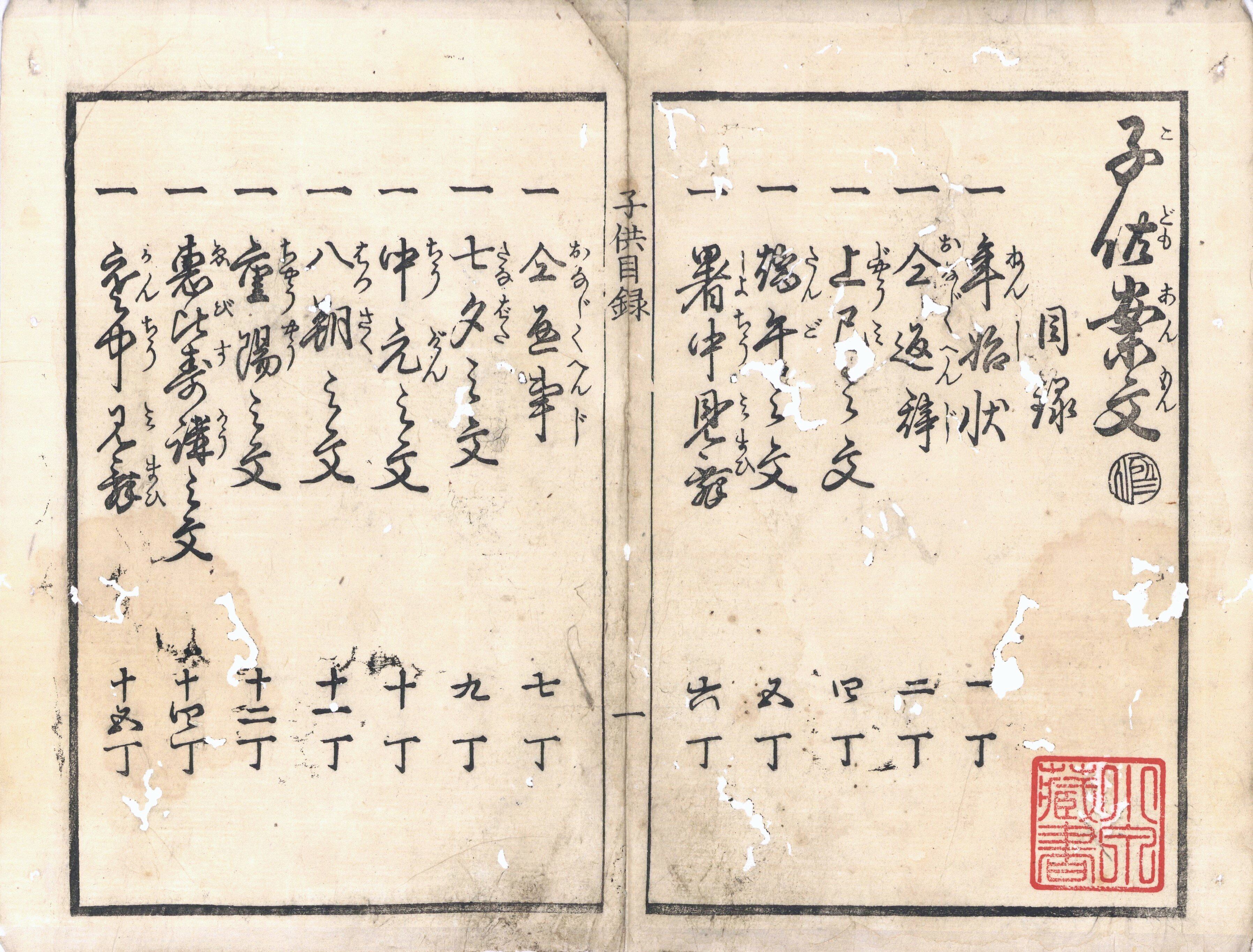 【備考】分類「往来物」。袋綴じ展開収録。『〈御家正流〉子供案文』の改編本。『〈御家正流〉子供案文』のうち、消息例文の一部と証文類の全てを削除した用文章。四季・五節句や通過儀礼に関する書状を中心に、「年始状」から「旅立怡之文」までの19通を収録する。本文を大字・4行・付訓で記す。口絵に板元・吉田屋文三郎(馬喰町四丁目)の店頭風景を描く。SE03058