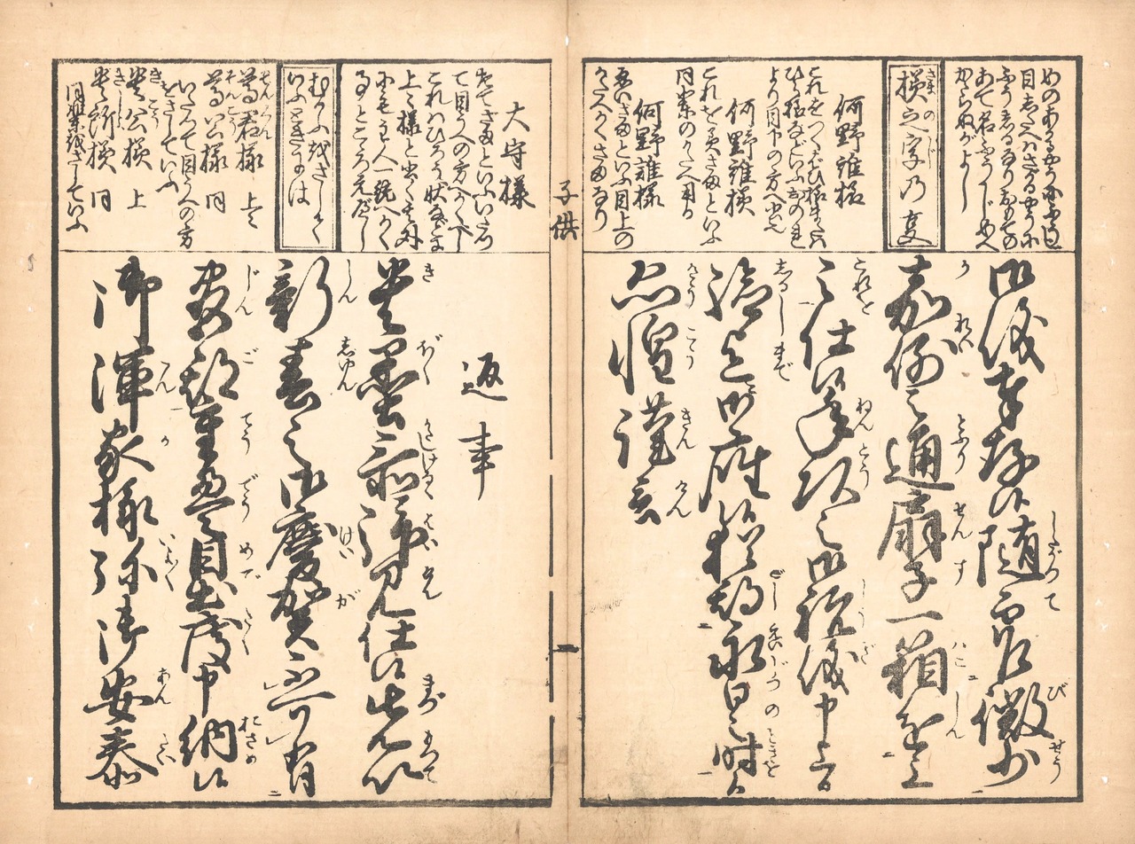 【備考】分類「往来物」。同板または類板3種を全冊収録した。『〈御家正流〉子供案文[子供案文〈手形証文入〉]』は、消息文例27通と証文文例23通を収録した用文章。前半の消息文例は「年始状」を始めとする五節句祝儀状や、通過儀礼に関する書状その他から成る。後半の証文類は「店請状」「奉公人請状」「地面売渡状」など基本的なものを収録し、巻末には証文類の書き方を記した「書法大概」を付す。本文を大字・5行(証文類7行)・付訓で記す。頭書に「書状封じ様」「様之字の事」「むかふをさしていふときには」「みづからをさしていふことば」など書簡作法・用語関連の記事を多数収める。本書には数種の異板があり、収録内容に小異がある。また、本書の改題本に江戸後期刊『大全一筆案文』がある。SE03060