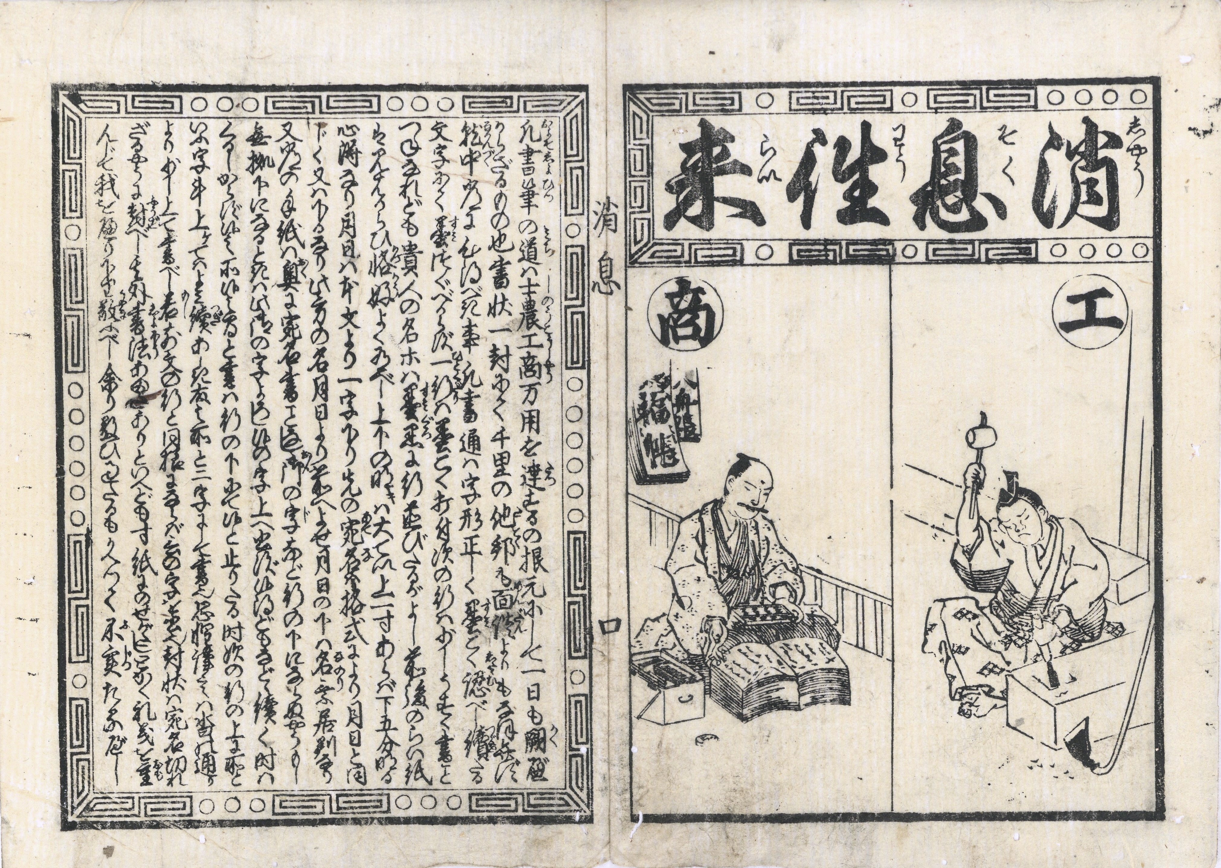 【備考】分類「往来物」。異板・類板など3種を全冊袋綴じ展開収録(見開き図再掲)した(ただし末尾の1本は、合計5丁の落丁があるため、異板の花屋板で補った)。『〈文章法則〉消息往来[御家流消息往来]』は、高井蘭山作、寛政5年刊『消息往来』の改編本。体裁や本文も酷似するが、文面には随所に異動がある。3種のうち最も早い刊行と思われる花屋板の場合、見返しに「士農工商図」を掲げ、冒頭1丁半に「書筆の道」や基本的な書札礼についての短文を収録し、「凡消息者、通音信、近所・遠国不限何事、人間万用之元也。先、書状・手紙取扱、文字一筆啓上仕、致啓達、令啓、以手紙申入尊書・尊翰・貴書・貴札・御状・芳墨・芳簡、御紙面・御剪紙拝見・拝誦、披見・披閲…」で始まり、「…脇付、参人々御中、人々御中、御宿所、尊酬、貴答・御報・御返事・返報・返答・返書、其品々多故、先、大概有増書記畢」と結ぶ文章で端作や手紙の尊称、四季時候の言葉、安否問答、武家公務、祝意・拝命、日月、出御・訪問、異存・同意、三都・その他都市、安寧秩序、約諾、会合・饗応・逗留、家作・普請、通過儀礼・慶事、家職・売買・租税・通貨、運送・交通、人倫等にまつわる語句、さらに、返状の冒頭語や養生、交友、年中行事・佳節、祭礼、縁組、褒美拝領、書止・脇付等の語彙を列挙する。SE03068