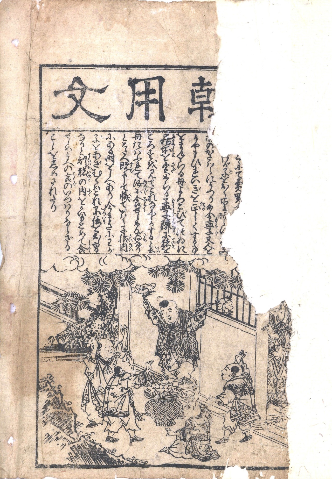 【備考】分類「往来物」。元禄11年初刊『〈新撰字典〉書翰用文章福字海』を改編した用文章。本文は「年始祝詞状」から「積送申船荷物之事」までの36通の消息例文と、「奉公人請状之事」から「差上申手形之事」までの5通の証文例文を収録する。消息例文は、四季贈答や通過儀礼、旅行その他諸用件の手紙などで、例文を大字・6行(証文は8行)・ほぼ全文を付訓で記す。巻頭に「孟母三遷」「孟母断機」「養老の滝」「匡衡」「李太白」「智永」の逸話を掲げ、頭書に「諸礼図抄」「献立書様」「魚鳥積やうの事」「魚鳥目録書やう」「四季之釈名」「八算かけわりの図」「見一わりかけざん」「時候之差別」「大日本国づくし」「扁冠づくし」「諸証文手形」、後付に「諸国御関御番所」「男女相性秘伝事」「文字上中下事」を載せる。なお、刊記の「文禄十一戊寅年」は、「元禄十一戊寅年」の誤記で、本書の元となった元禄11年初刊『〈新撰字典〉書翰用文章福字海』([江戸]鱗形屋孫兵衛板)を示す。SE03072