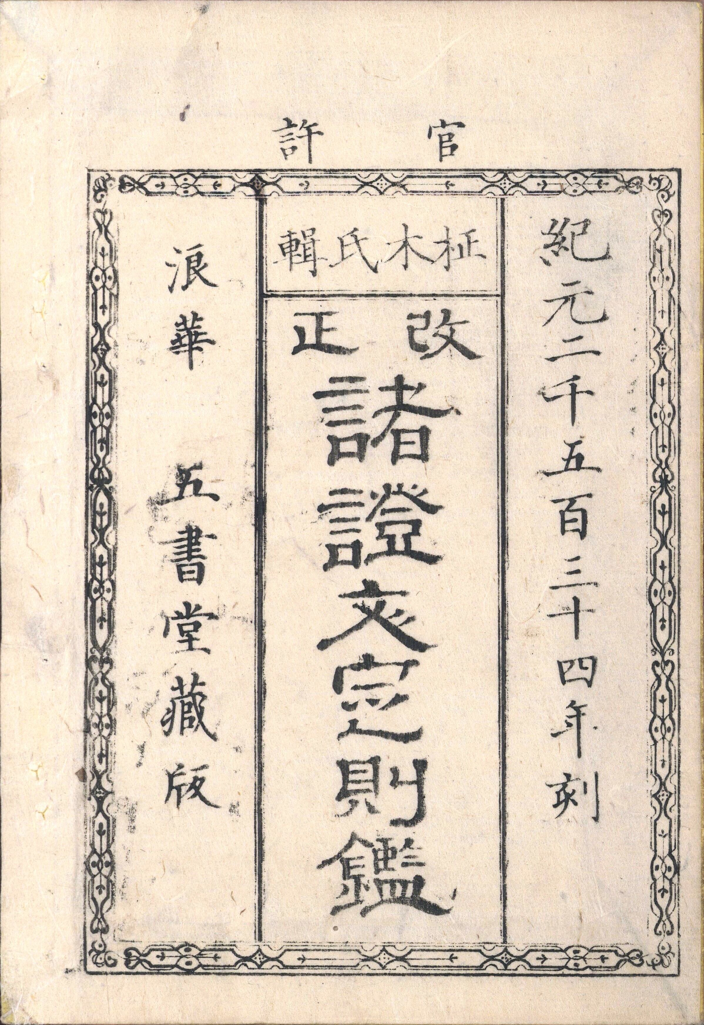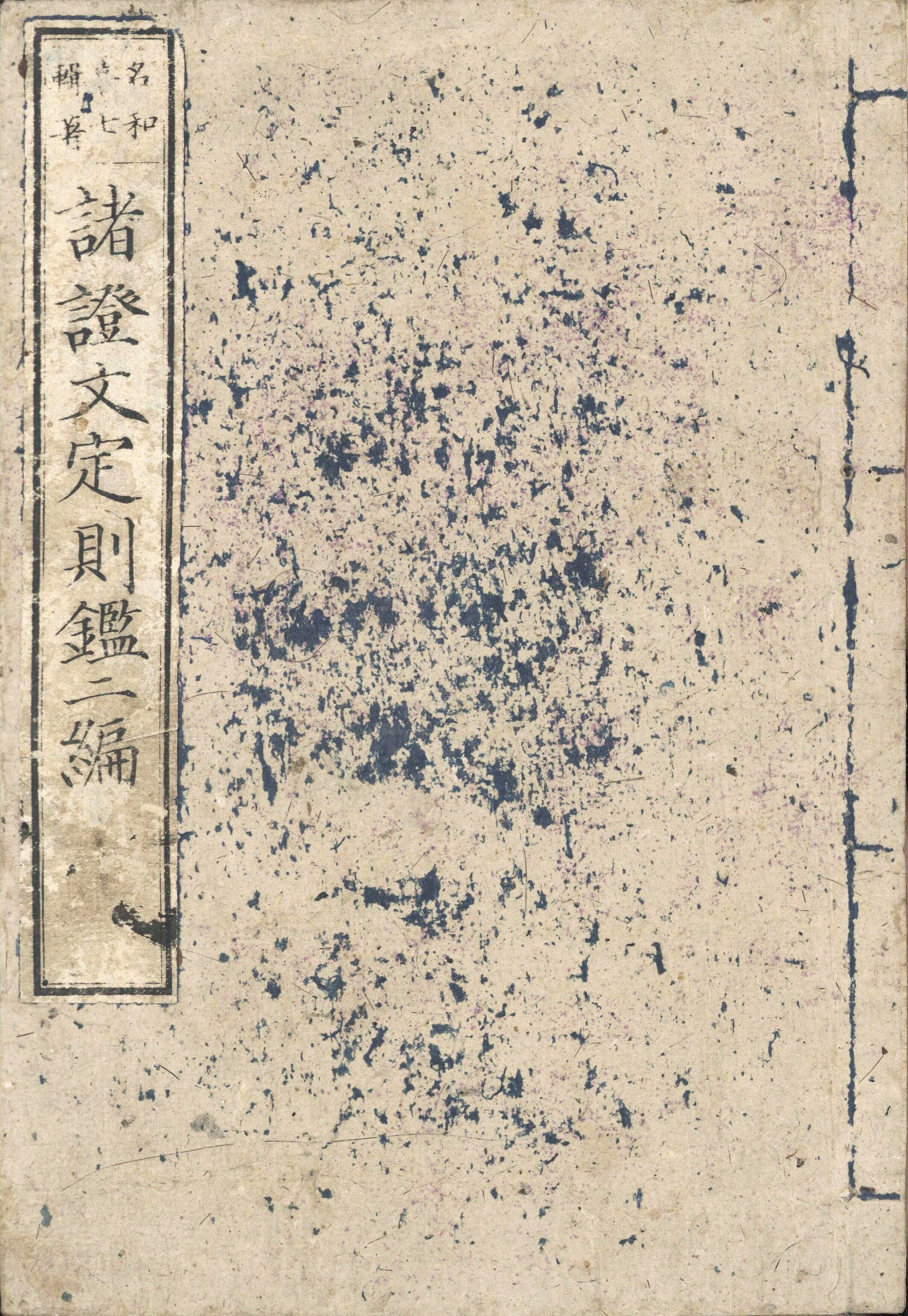 【備考】分類「往来物」。初編2種と2編の3冊を全冊袋綴じ展開収録した。『〈改正〉諸証文定則鑑(初編)』は、明治3年刊『〈改正〉諸証文定則鑑』の改訂版。明治3年板は、明治3年3月の官令改正に伴い、法律で規定された各種証文類の書式を集めたもので、借用証文・預り金証文・年賦証文・質証文・田畑小作証文・年季奉公人請状・奉公人請状・借屋証文・並合物証文・跡式証書・養女貰い受け証文・養女差し遣わし証文・女房敷金証書・乳母請状・売り渡し証書・売り預け証書・両替通い証書・手付金証書・手付金買主証書・家屋敷質物証文の22通を収録する。明治7年の改訂版は、同体裁で「借用証文雛形」から「並合物証文雛形」までの25通を収録し、本文を大字・7行・無訓で記す。また、『〈改正〉諸証文定則鑑(2編)』は、巻頭に明治6年2月17日の太政官布告「金子請取、金銀貸借、地所売買、質入書入、為替請取諸約定」を掲げ、第一類・第二類・界紙之部の3部に分けて、順に「御下ゲ金請取証書」から「預り金証書之事」までの7種、「借用金子之事」から「借用申正米之事」までの11種、「養子請状之事」「証券引当借用金之事」の2種、合計20種の証書書式を掲げる。本文を大字・7行・稀に付訓で記す。SE03073