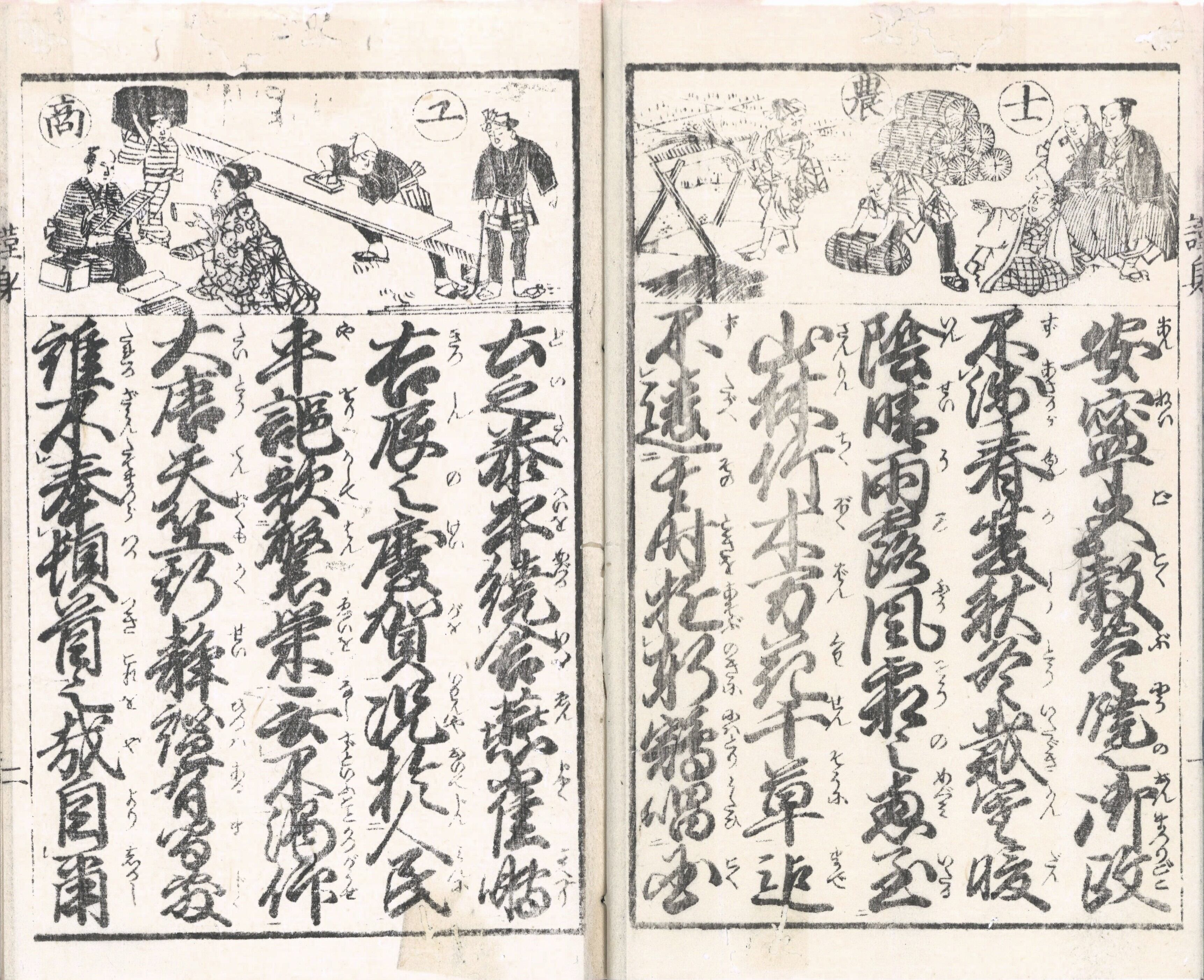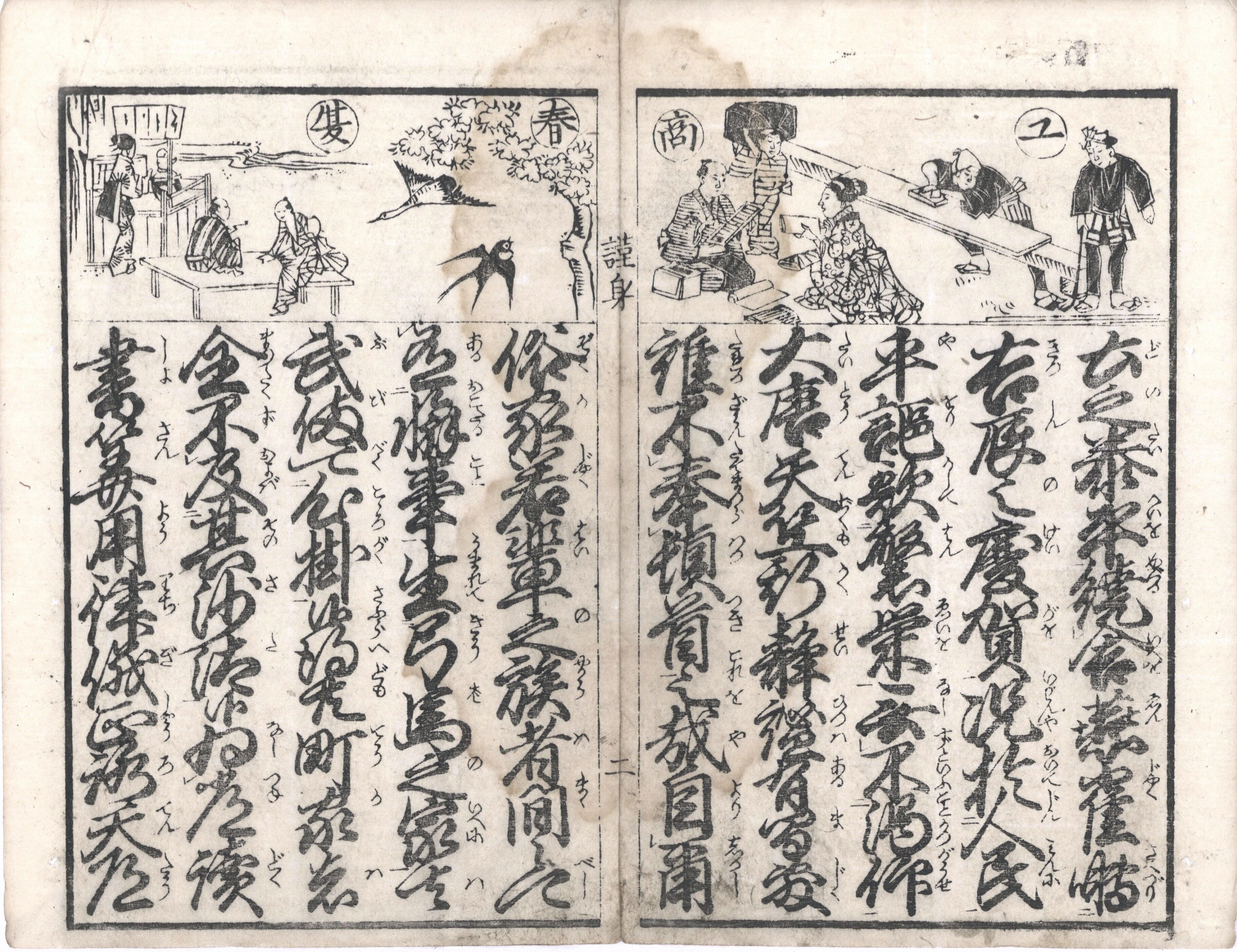 【備考】分類「往来物」。同板2種を全冊収録(前半早印本は袋綴じ展開収録、後半後印本は通常収録)し、冒頭に書袋を収録した。『謹身往来』は、主に江戸町人のために日常語や生活心得全般を綴った往来。準漢文体の文章で、まず「抑教之有増者、人々心得可有事、先以、四海波静治、目出度御代、日夜朝暮三綱五常之道行、国民安寧、五穀富饒之御政不浅…」と国家泰平を謳歌する文言から書き始め、町人子弟の心得(学業・行状・悪行)、公序良俗、江戸の名所・名物、家庭医療、衣類、工芸品、宗教、諸職・諸商人(諸商品)、家財等にいたる用語・知識を列挙し、最後に、善悪を弁えて煩悩や瞋恚を去り、倹約・算勘・柔和・忍辱・忠義・孝行・勤勉に生きるべきことを諭す。底本は、同本文を5行・付訓で記し、表紙見返しに「菅原道真の肖像と和歌を掲げ、冒頭2丁半の頭書に読書指南図や士農工商図を掲げる。SE03104
