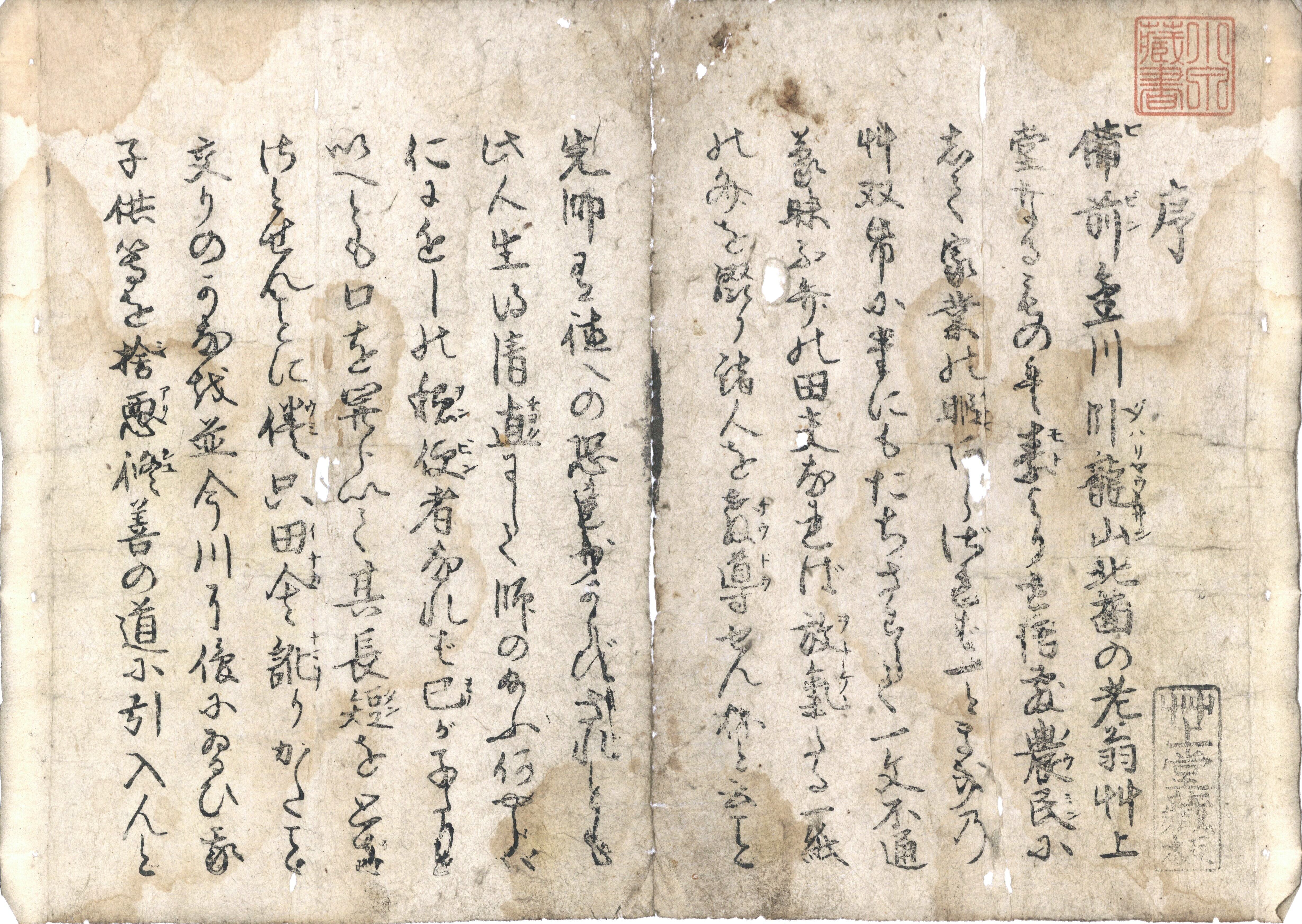 【備考】分類「往来物」。同板2種を全冊袋綴じ展開収録した。『てら子の友』は、前半『手習児(テラコ)の友』と後半『何やら双紙(草紙)』から成る教訓歌主体の往来物。前者は「いとけなき身にも五常のみちすぐに、まなびてわたるひとゝこそなれ」で始まるイロハ教訓歌48首で世俗的な生活教訓を説く。後者は「夫、人生れて八才にして小学に入とあるなれば…」と筆を起こして余力学問・孝行・友情・礼儀・家業出精・正直・積善などについて諭し、一話毎に教訓の趣意を詠んだ教訓歌を掲げるのが特徴。本文を概ね大字・6-8行・所々付訓で記し、数カ所に素朴な挿絵を挟む。序文に「備前金川臥竜山北面の老翁」と記し、冒頭に「艸上堂蔵板」とあるように、地方における私家版として貴重である。