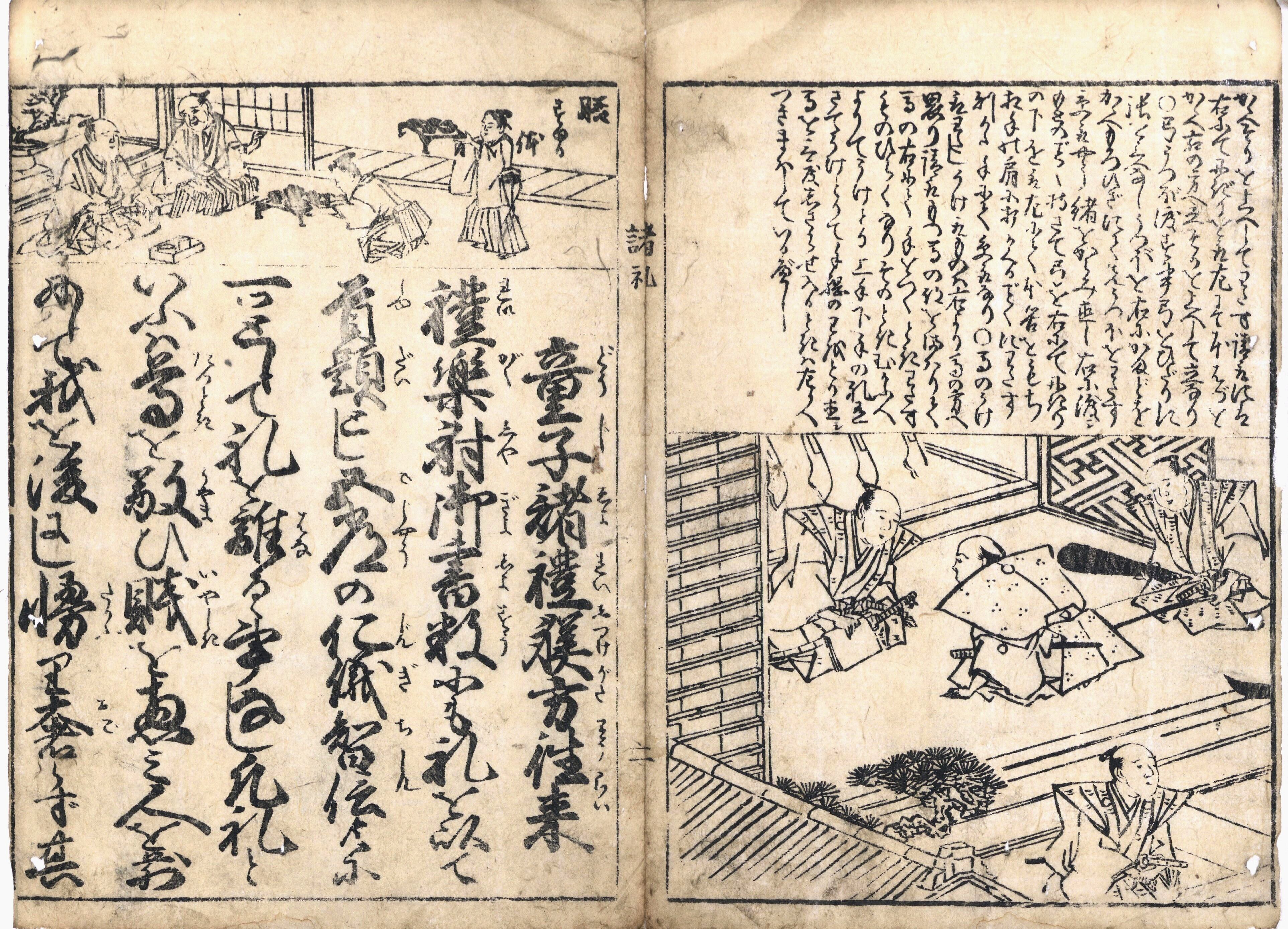 【備考】分類「往来物」。後印本2種(2冊目は口絵破損)を全冊袋綴じ展開収録(見開き図再掲)した。『童子諸礼躾方往来』は、庶民子弟用に客方食礼から給仕方作法までの礼法の基本を記した往来物。まず、礼は六芸(礼・楽・射・御・書・数)の筆頭であり、五常(仁・義・礼・智・信)にも含まれる重要な徳目であること、また、礼の意味すなわち、礼は「尊(たっとき)を敬ひ、賤を恵み、人を前にして我を後にし、慢(たかぶ)り奢らず、其分際を弁へ、柔和温順にして、多言なく、悉慎(しっちん)(悉鎮)の心怠らず、平生人に挨拶・応答、起居進退、皆、礼に依而(よって)簡別(けんべつ)(甄別)す」るものであるから、幼時よりこれを習うべきことを説く。諸礼の躾方には家々の流儀はあるが、最も基本的な事柄をいくつか紹介するとして、「客と成つた時の心得」である食礼全般(膳部・酌盃・菓子)と濃茶について述べ、後半で「中輩以下の童蒙」が熟知すべき給仕方作法(配膳、飯の再進、汁の通い、酌、客人への手水、障子・襖(ふすま)の開閉、客の出入りの給仕、貴人へ扇子・小刀の渡し方、書状の披露、上下着衣の介添え、脇差・刀の渡し方等)の基本を説く。前付に「反哺の孝・三枝の礼」「万受取渡しの図式」、頭書に「献立の書やう」「万積方之図」「目録之書法」「箱曲物書やう」「万対名之事」「万折形大体」、巻末に「四季十二月異名」等の記事を載せる。SE03116