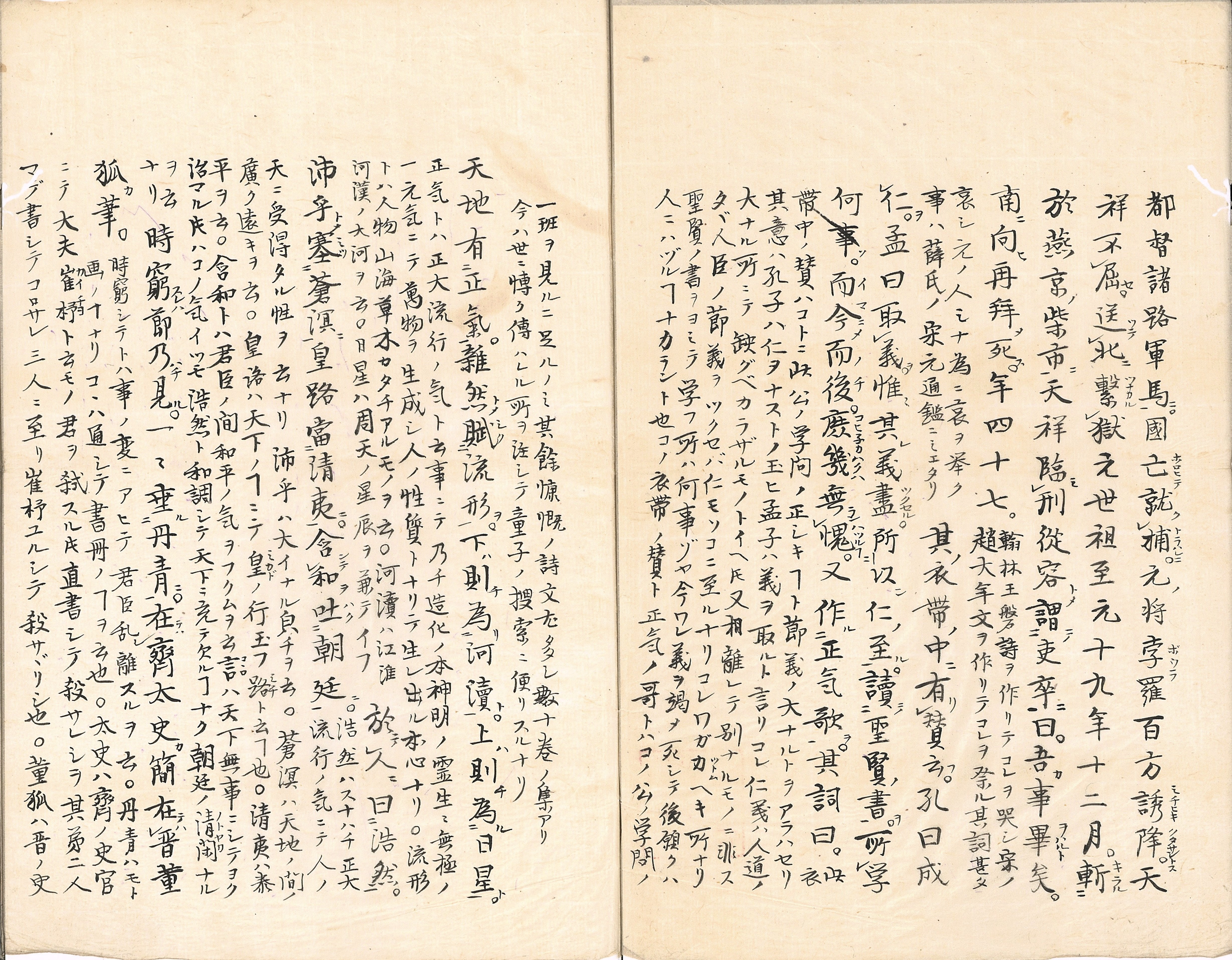 【備考】分類「往来物」。『正気歌諺解[正気歌童子訓]』は、文天祥作『正気歌』と、その模倣作である藤田東湖の『日本正気歌(和文天祥正気歌(ブンテンショウセイキカヲワス))』の2つを収録してそれぞれ詳しく解説した注釈書。前半に収録された文天祥作『正気歌』は、「天地有正気、雑然賦流形、下則為河嶽、上則為日星…」で始まる五言60句の漢詩(五言古詩)で、宋末の宰相文天祥が元軍と戦って敗れ捕らえられ、元の大都(北京)の獄中にあって作った五言古詩で、節を曲げず忠義を貫く心をうたったもの(コトバンク)参照)。底本前半部は、この『正気歌』を五言4句ずつ掲げて詳しい割注を施したもの。また、後半部は、『正気歌』になぞらえて藤田東湖が著した漢詩『日本正気歌(和文天祥正気歌)』で、「天地正大気、粹然鍾神州、秀爲不二嶽、巍巍聳千秋…」と起筆する憂国の詩で、9代水戸藩主徳川斉昭の江戸召還を機に幽閉された際に書かれたとされ、幕末の対外的危機の中で忠君愛国の精神を謳い、尊王攘夷派の志士たちに愛唱されその士気を高めたという(茨城大学HP参照)。これを後半部に収録して同様に施注するが、数句から十数句、場合によっては20句以上の文章に分けて割注を施したもの。底本は、自筆稿本と思われるが、別筆で巻末に「楠公碑陰ノ舜水先生ノ讃辞」1丁を付す。SE03128