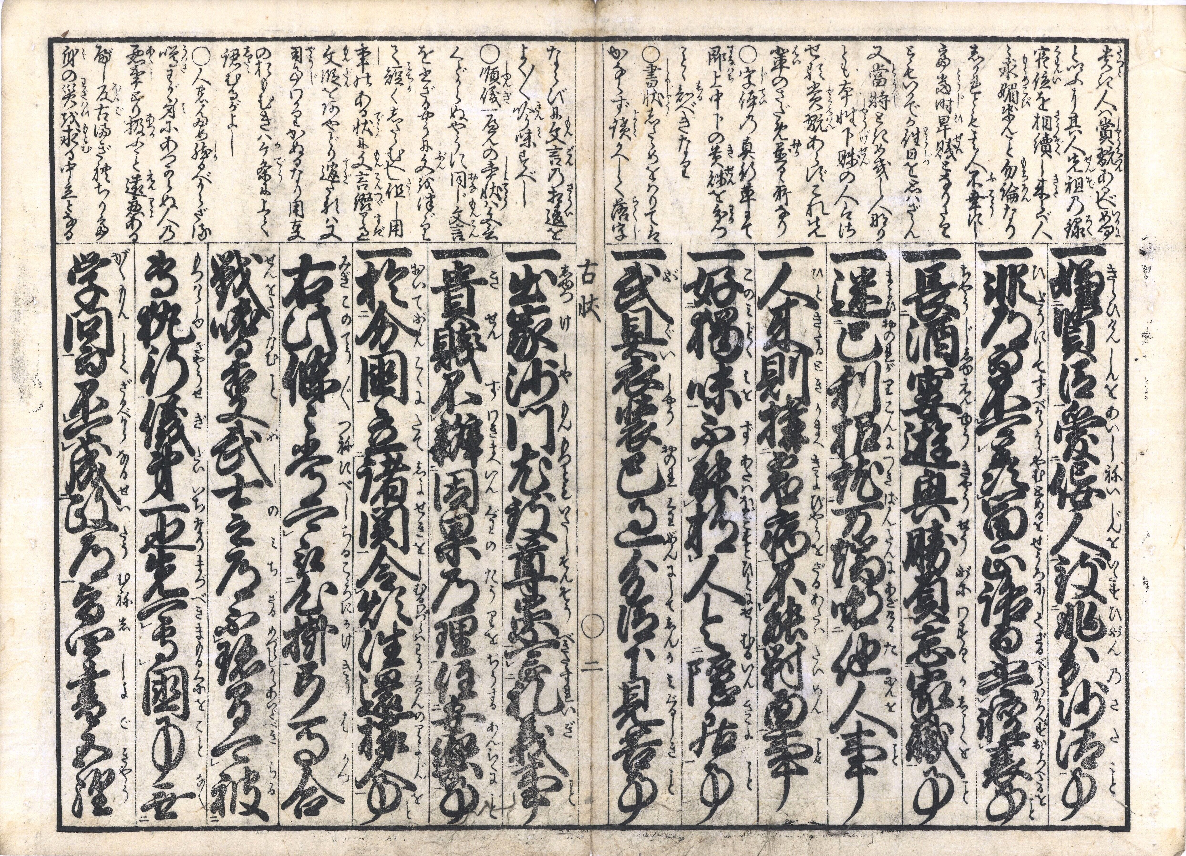 【備考】分類「往来物」。同板2種を全冊袋綴じ展開収録。『文貨古状揃倭鑑(仙台板)』は、「今川状」「手習状」「腰越状」「義経含状」「弁慶状」「熊谷状」「経盛返状」「大坂進状」「同返状」の古状類9編を収録した古状揃。見返に「張良故事」、前付に「偏傍冠沓字画指南」「王羲之故事」「小野道風故事」を掲げ、頭書に「当用文法之口伝」「書状案文」「万用通途手形鑑」「吉書始之詩歌」「乞巧奠詩歌」を載せる。また、後付に「不成就日事」「十二月和名」「十二時之異名」を付す。SE03139