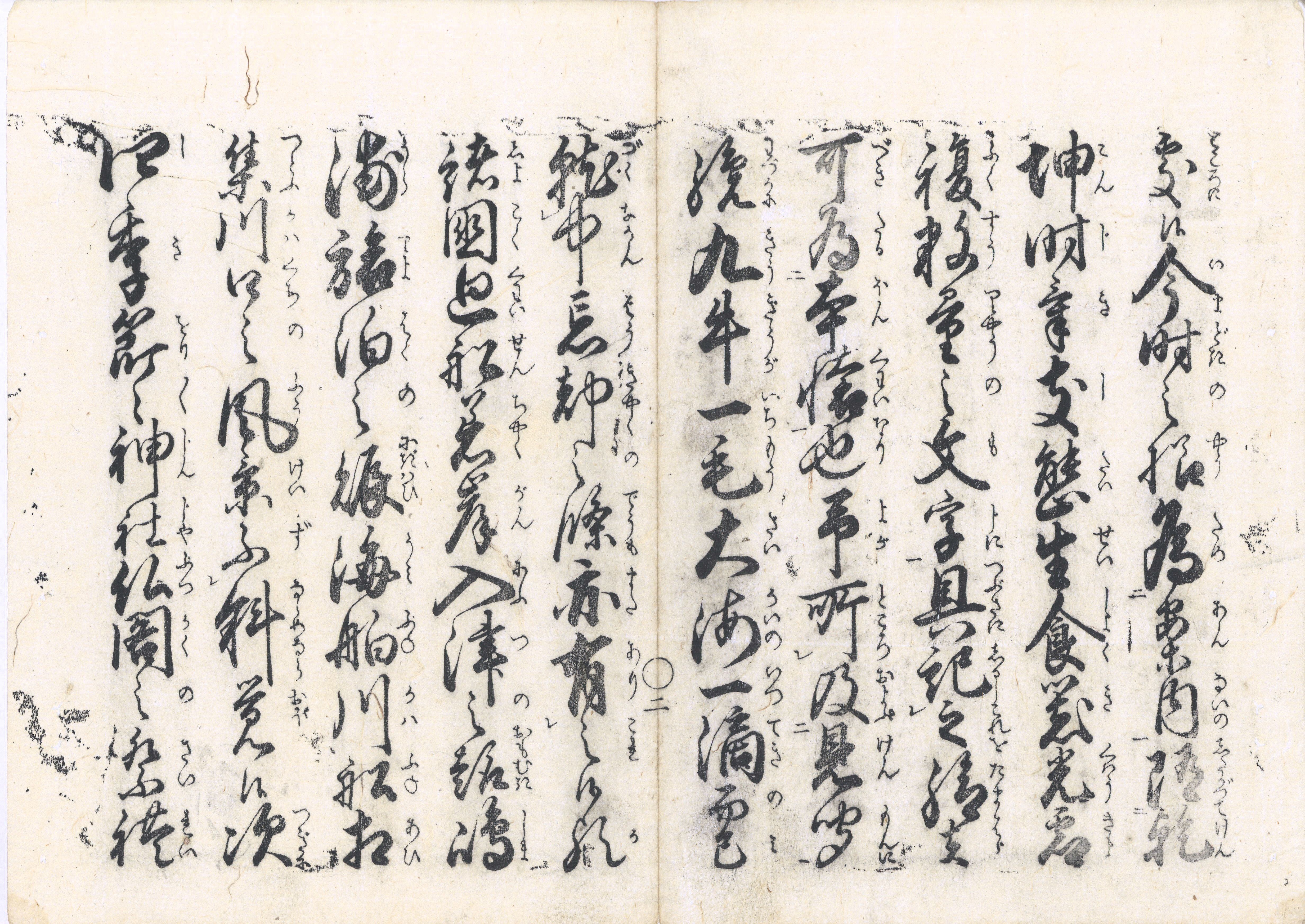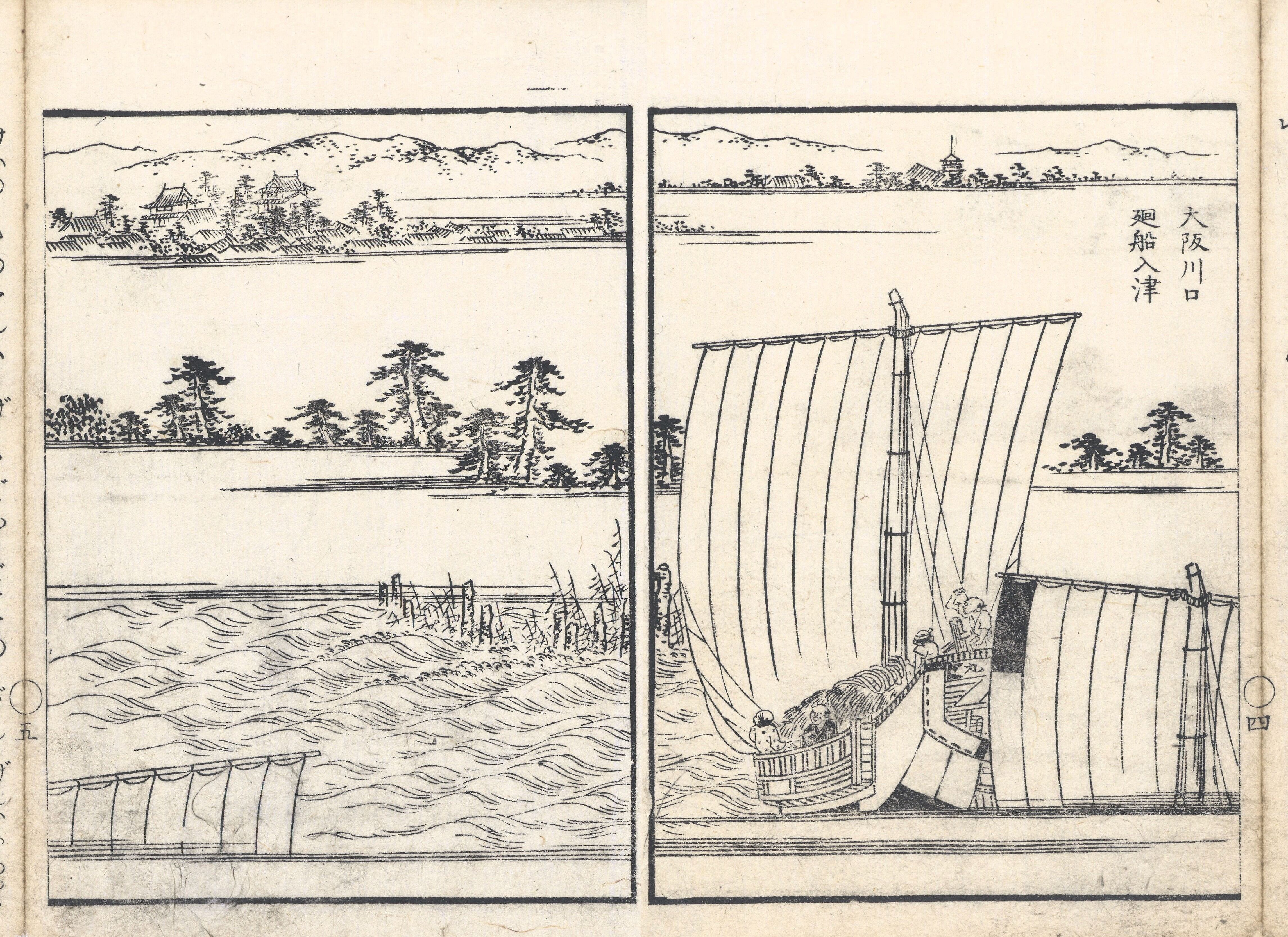 【備考】分類「往来物」。嘉永板と後印本の2種を全冊袋綴じ展開収録(見開き図再掲)した。『〈絵入文章〉大坂往来』は、貞享2年以前刊『大坂往来』に大幅な増補を加えた往来物。「一翰令啓達候。先以御健勝之条、珍賀千万…」で始まる往状と「去程遼遠之処、御報書速到着、珍重々々…」で始まる返状の2通の書状形式で、「大坂津の賑ひ、神社仏閣月並・日なみ祭礼・縁日、名所旧跡・遊興の地、名物・名産、河海の魚肴・絹布・器財・薬種丸散・衣服・諸道具・草木・野菜に至るまで」(本書広告)を網羅的に列記する。江戸前期刊本よりもはるかに浩瀚な(約2倍強)地誌であり、同書の語彙集団を膨張させて一種の日用語辞典へと発展させている。本文を大字・5行・付訓で綴り、見開き挿絵8葉(大坂川口廻船入津・年始諸礼・天神祭夕涼・魚貝・住吉反橋・草花・天王寺遠望・四ッ橋景色)を掲げる。SE03156