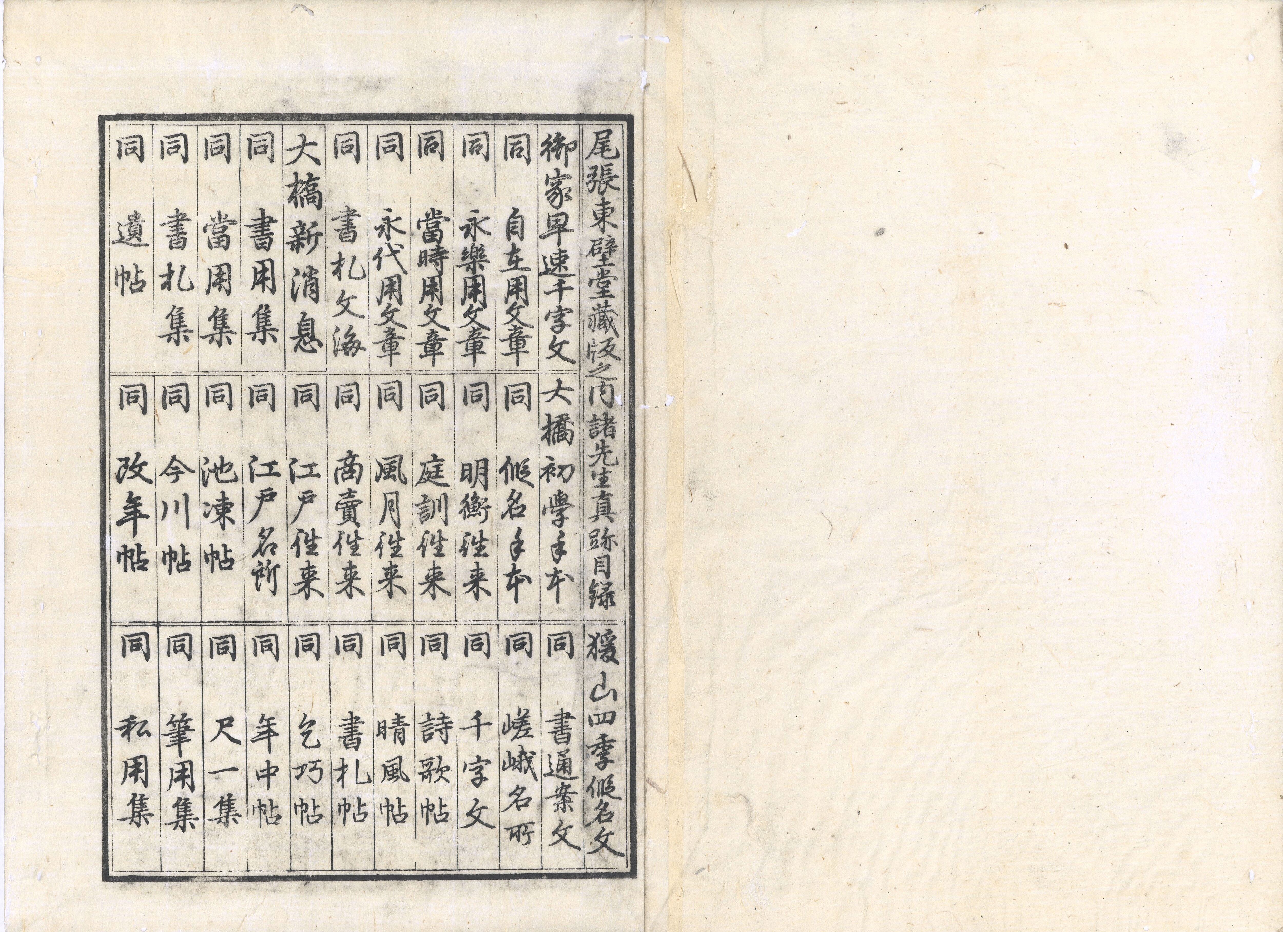 【備考】分類「往来物」。袋綴じ展開収録。冒頭に書袋を付す。『大橋江戸名所』は、江戸の名所を綴った一文と消息文数通を合本した大橋流の陰刻書道手本。「大橋江戸名所」は、「此春は花の比、神社仏閣御巡礼有べきよし、順路申進じ候。先、神田湯島両社を拝し、東叡山則金城之艮護鬼門霊場にて寛永年中御草創也…」と起筆し、江戸府内の寺社や名所旧跡を順々に紹介した後、「…右有増如此候。猶又、功者之人え御聞合順参可被成候。頓首」と結ぶ。続いて、昨晩の饗応に対する礼状など4通の消息文(準漢文体書簡と散らし書きの仮名文)と和歌1首を付す。いずれも大字・3行(散らし書きを除く)・無訓で綴る。SE03158