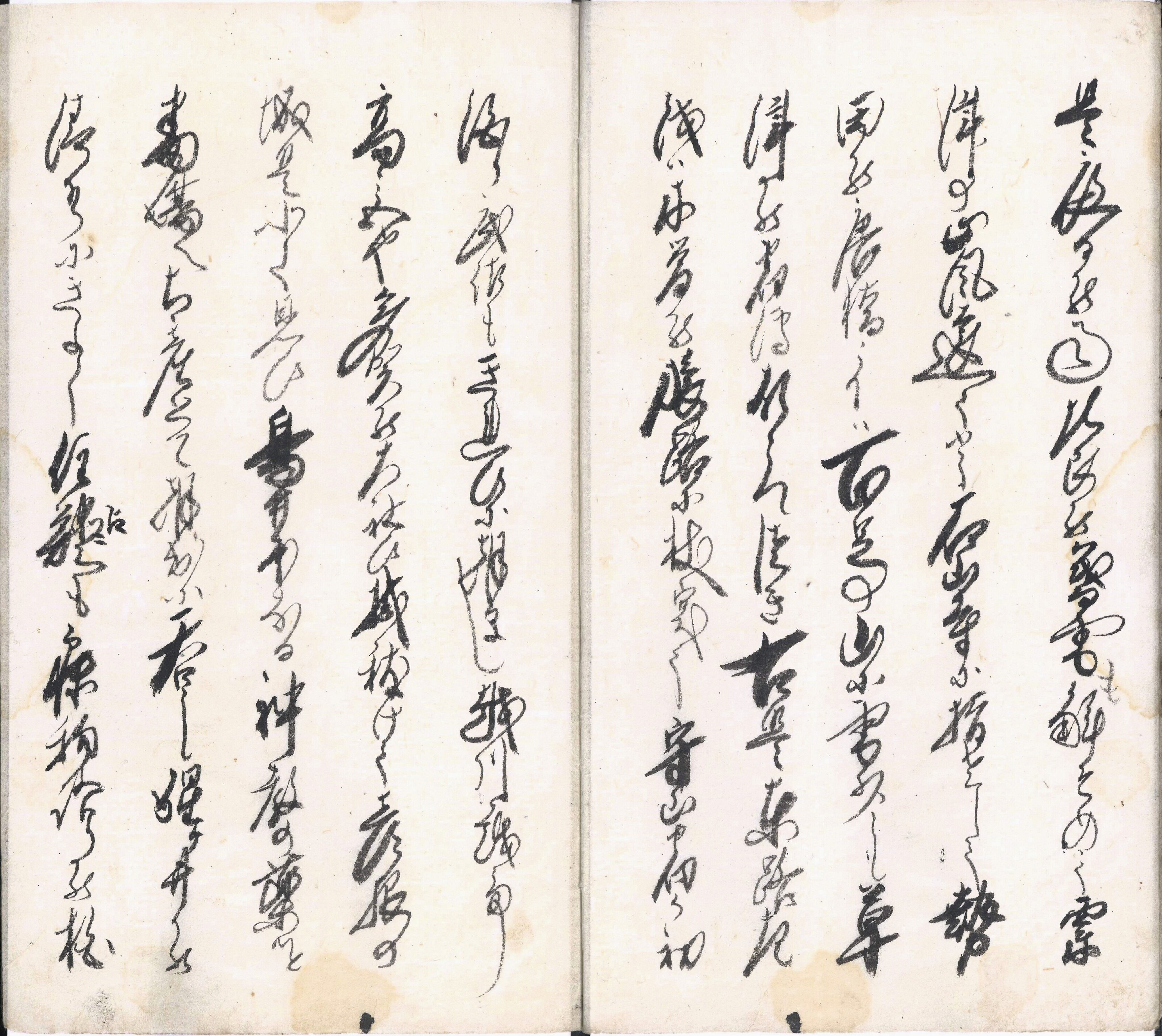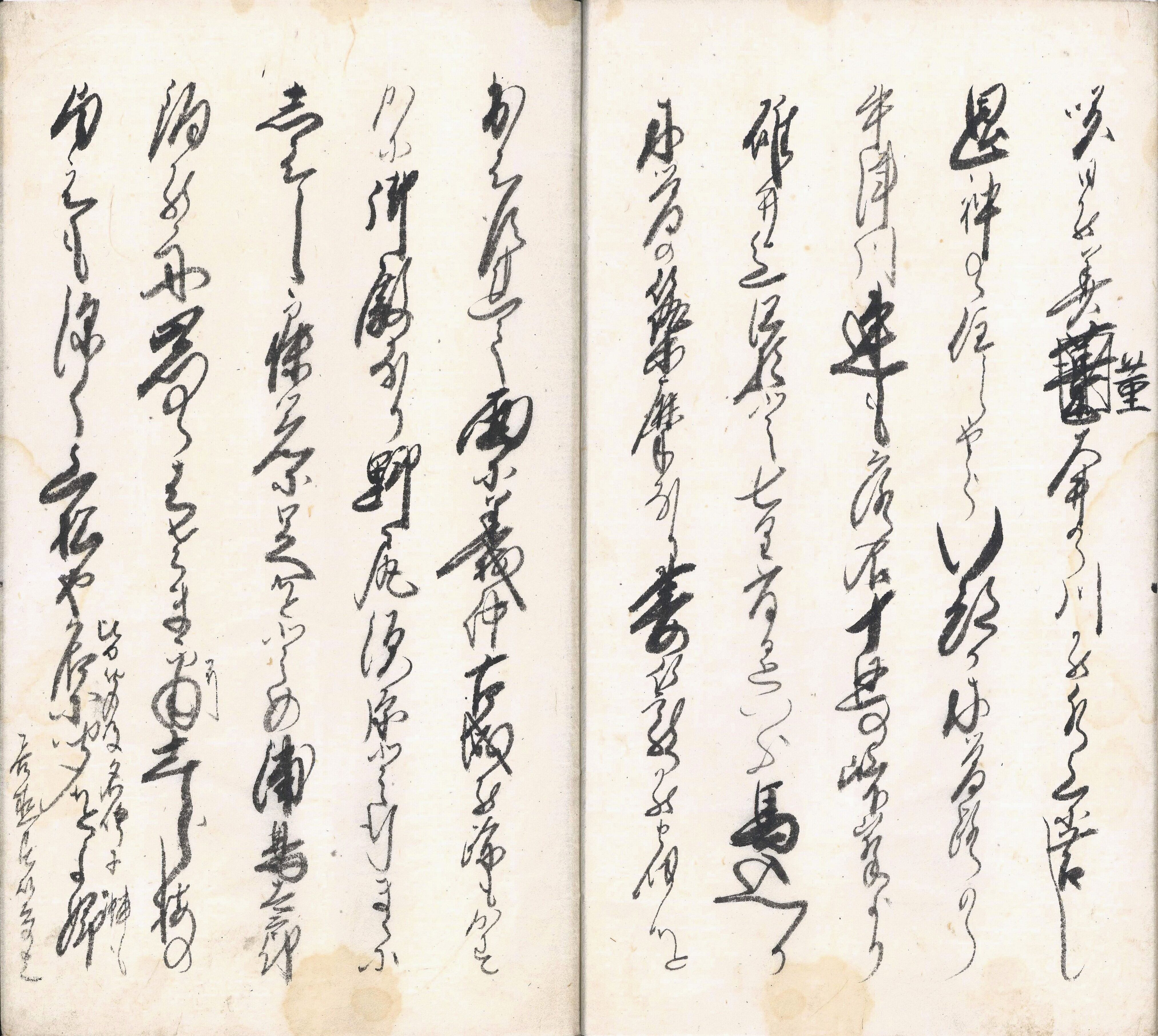 【備考】分類「往来物」。2冊とも、信州佐久郡熊久保村(現・長野県佐久市伴野熊久保)の原家で使用された手習本。第1冊に「松喜蔵■(書?)」「信州佐久郡熊久保、原両平」「嘉永七年寅十二月、人王三十一代、熊久保、原徳助書」、第2冊に「進上、小原、相浜村、碓氷伝兵衛」の書き入れがある。『木曽路下向往来』は、京都三条大橋から、信州軽井沢宿(長野県北佐久郡軽井沢町)までの中山道を宿駅を、その沿道の名所や風景を読み込みながら綴った往来物。嘉永7年本は、「華の錦の九重の、空は六十路の衢にて、渡りはじむる三条の、大橋越て三井寺の、鐘の闇に車牛、歩行も早き大津宿、琵琶の湖を見わたせば、矢橋の郷帆も薄霞、堅固の雁も囀ば…」と起筆し、「…少し噺して岩村田、小田井の蛙啼そめて、浅間嵐も只さむく、相生宿を追分と、誰か名を附て沓掛や、蜘場ヶ原に不改、居る鶴の羽筆も遠とふと、荷物も足も軽井沢」と結ぶ。SE03171