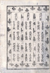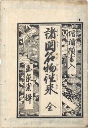 【備考】分類「往来物」。中本を主とする類書5種を全冊袋綴じ展開収録した。『諸国名物往来[名物往来文宝蔵]』は、近世中期における全国の名産品を列挙した往来。「先、洛陽西陣之綾織、上京誂染、室町呉服、鼠屋柄糸、岩井具足、埋忠鉄仁、正阿弥鍔、御影堂扇、御所文庫、内裏雛…」と京都の名産・名物から書き始め、以下、各地の農産物、海産物、工芸品、加工食物、醸造品などを随意に列挙する。ただし末尾は若干の分類意識によっており、「衣服之品」「異国之渡物(衣類・薬種・金石・工芸品等)」の数々を列記する(末尾は諸本によって若干の異同がある)。諸国名物を題材にした寛文9年刊『江戸往来』、貞享5年刊『日本往来』、貞享頃刊『名物往来(仮称)』、享保12年刊『古今銘物往来』などはいずれも地域別または品目別に列記するのが常であり、この点、本往来は特異である。なお、刊年を明記する最古本は大本の安永7年刊『〈新版大字〉諸国名物往来』だが、同書題簽角書に「新版」の二字を加えるから初板本はさらに遡るとも考えられる。このほか、巻頭に「天満宮縁起」「近江八景」、巻末に「願成就日・不成就日」「月の出、しほのさし引の事」等の記事を掲げた中本の村田屋板も明和頃で、比較的早い刊本である。SE03194