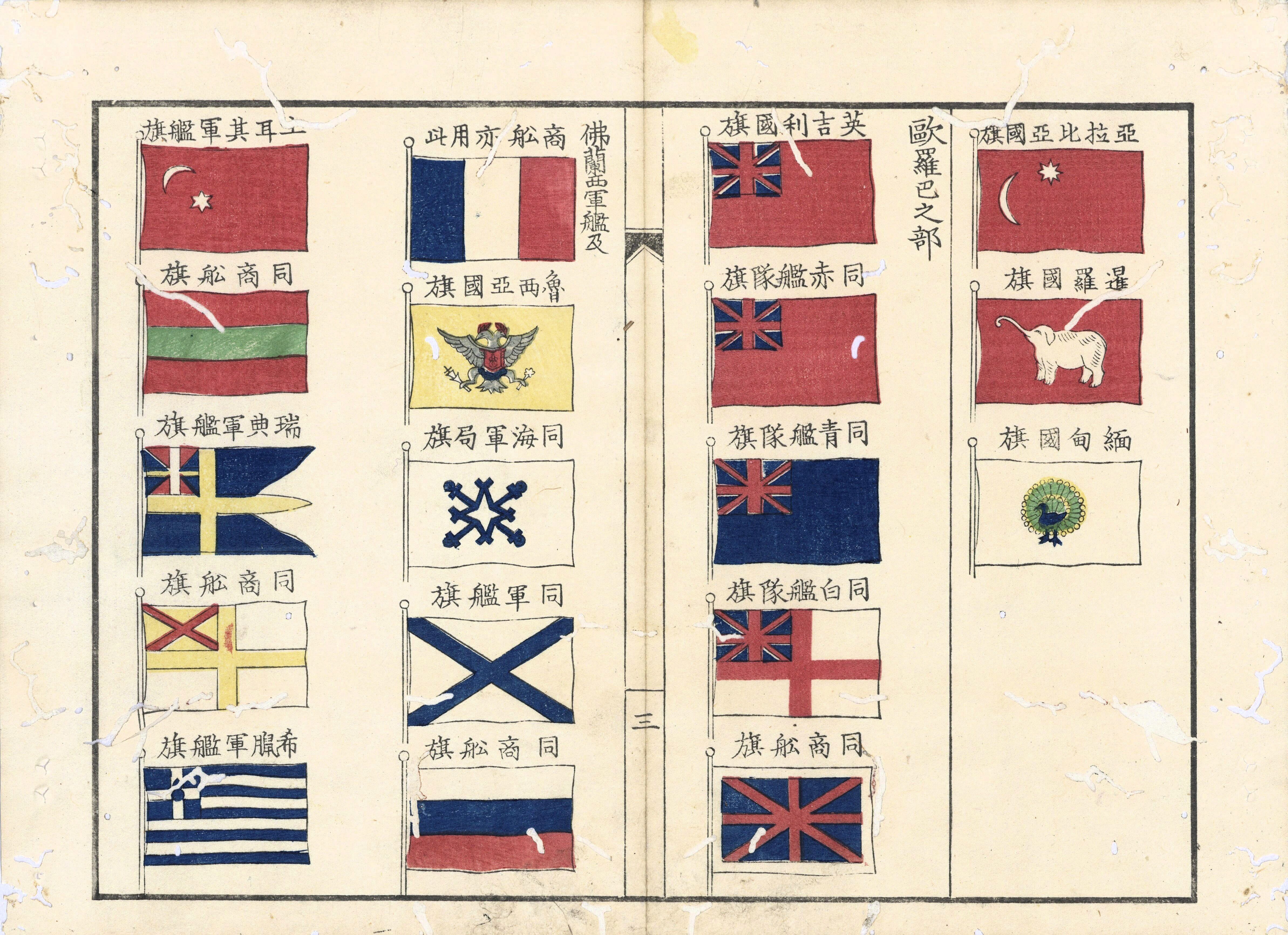 【備考】分類「往来物」。色刷り国旗図増補を付す版とそうでない版の2種を全冊袋綴じ展開収録した。『〈内外旗章〉地球国名』は、『地球説略』等の書物によりながら、世界各国の名称や国土・人口等について記した教科書。六大洲(亜細亜・欧羅巴・阿非利加・澳大利亜・北亜墨利加・南亜墨利加)毎に諸国名を楷書・4行・付訓で掲げ、続いて国体・面積・人口・別称等を示し(記していない国もある)、頭書に関連の地名を紹介する。国名を全て漢字表記で大書し、その読みを片仮名で小さく付記する。また各洲の初めに、その領域を記載する。また、巻頭に「五人種図」「東・西半球図」を掲げるほか、各国の国旗を図解(色刷)した「〈内外〉旗章便覧(日本の旗は御旗・臨時行幸旗・皇族旗など29基。諸外国は朝鮮国旗以下76旗)」を増補した版もある。SE03222