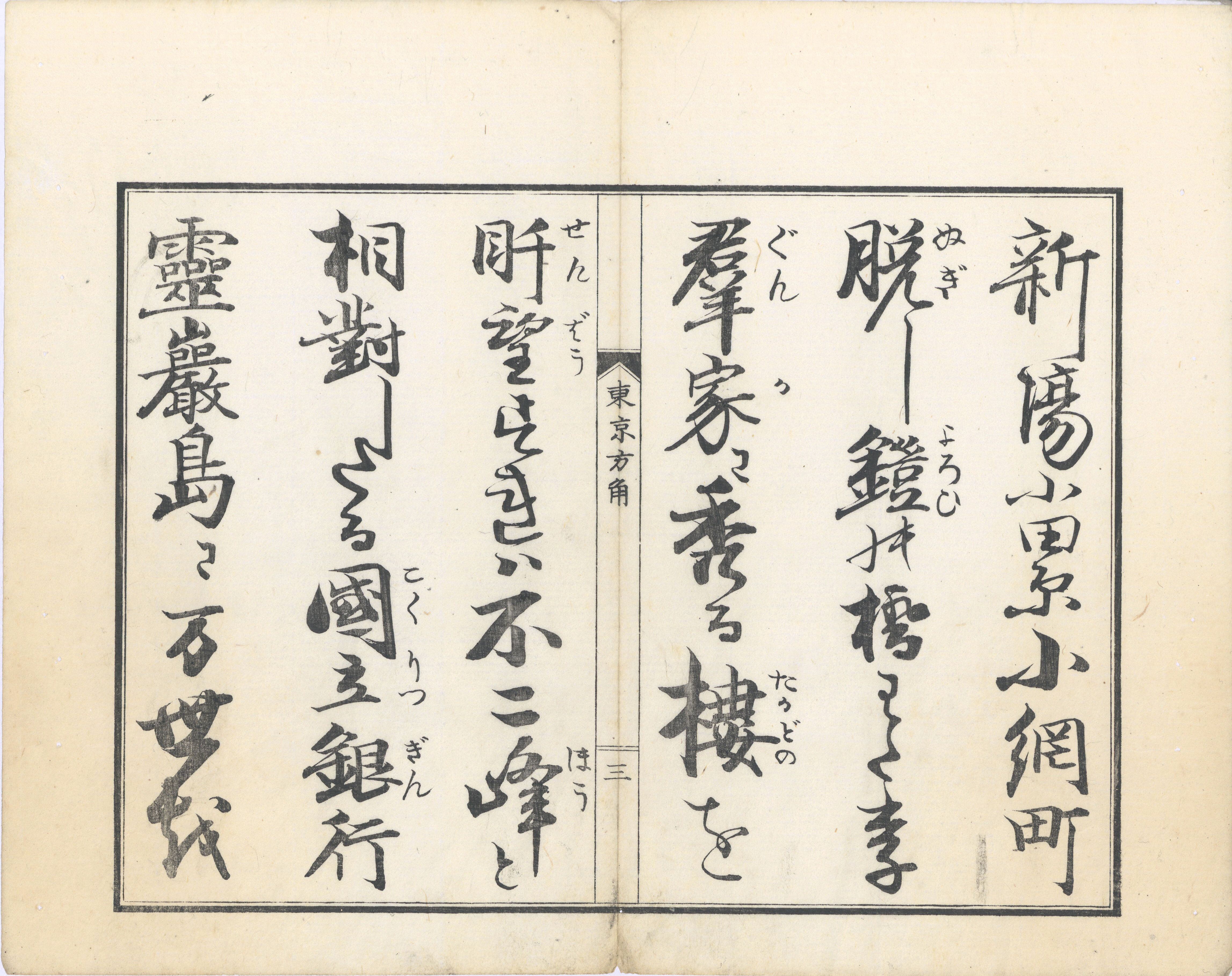 【備考】分類「往来物」。『東京方角習字本』は、近世流布本の明和2年刊『御江戸名所方角書(江戸方角)』の明治期改編版の一つ。「王政維新東京の、街の方角惣計は、一千百七拾七ヶ町、先卯ノ方ハ宝田・祝田・千代田町、和田倉渡り八重洲町…」と書き始め、「為替会社の三井組…」「富士峰と相対したる国立銀行…」「わたりて傍に蒸気車の、乗場立派にステーシヨン…」「瞬く中に用便を、なすは自在のテリグラフ…」のように近代的な事象を随所に盛り込んで、明治初年の東京を描く。本文を大字・3行・所々付訓の手本用に記し、稀に付訓を施す。SE03233