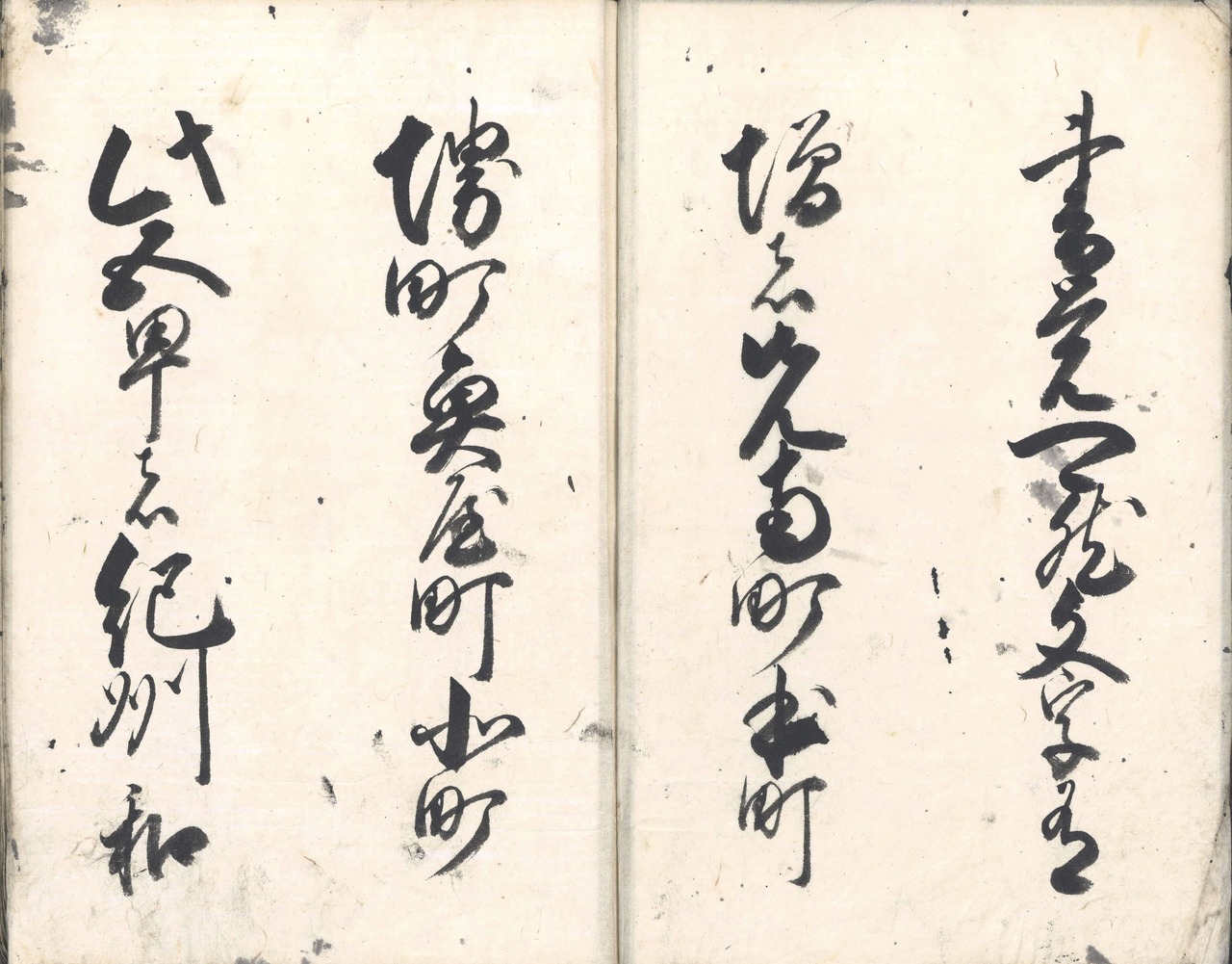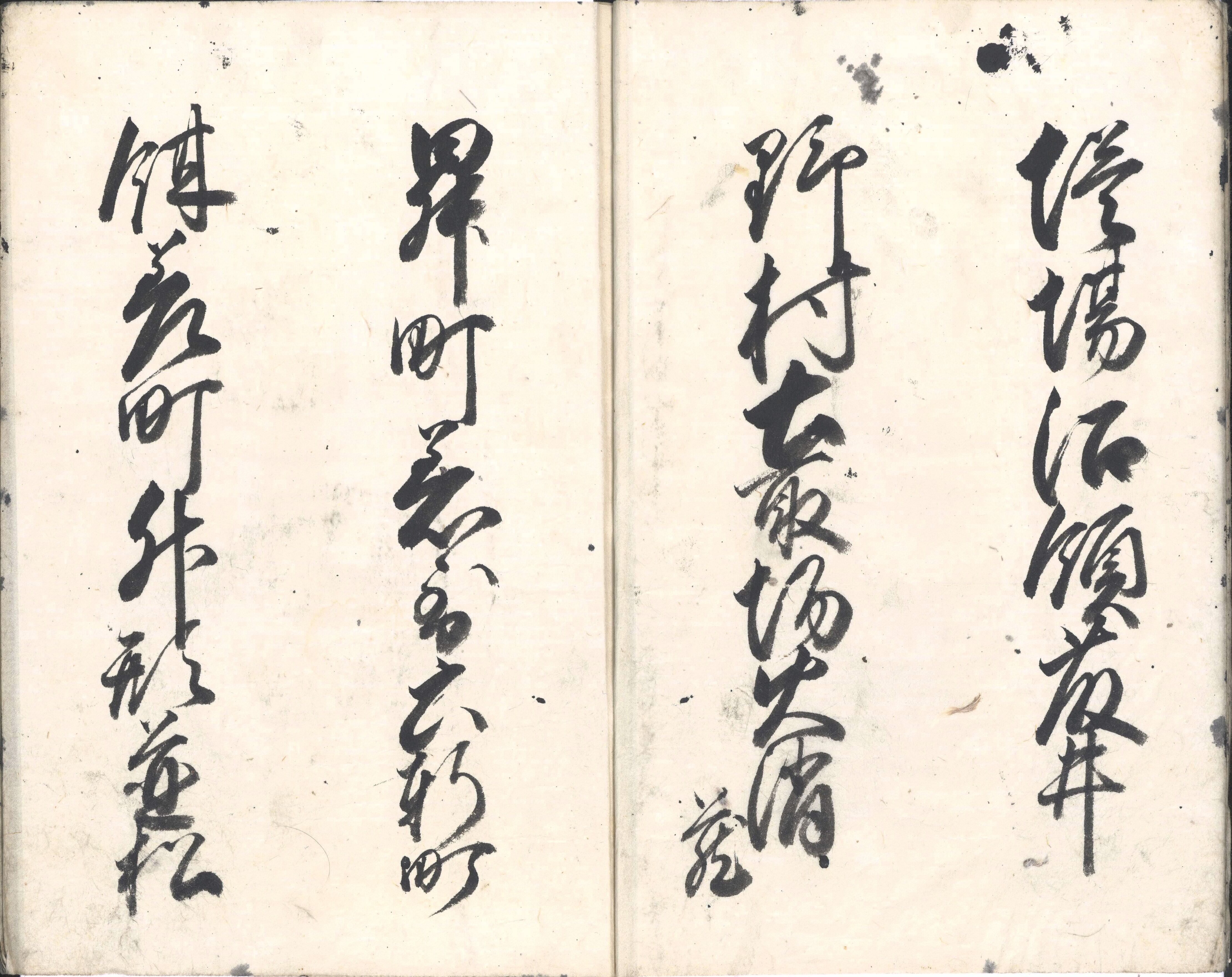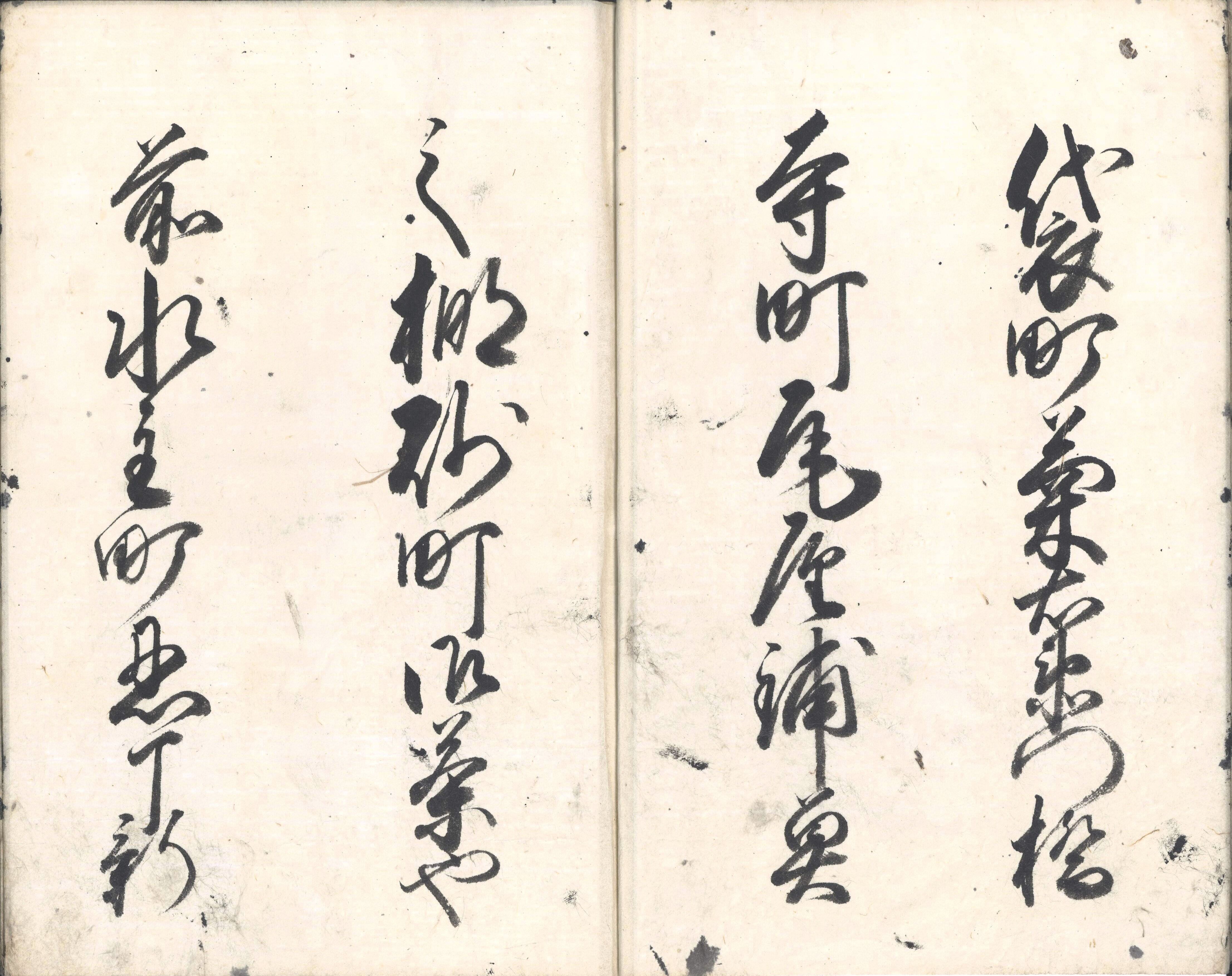 【年代等】江戸後期書。『当地往来・町名書』は、紀州地方の寺子屋で使用された往来物。「抑当所手習子供書覚可然文字有増者、先、南町・本町・堺町・魚屋町・北町、此五町者紀州和歌山より京・大坂迄之海道なり…」と書き始めて、紀州城下の町村名・街路名、また薬種・文具・灯油・醸造品・青物・干菓子・小間物・食器・材木・布帛織物・煮売など各種商品と取扱店名(屋号)、諸国との通商・通信、伊勢参宮等の旅行、諸国道法、諸寺・宗旨等について記す。現存本は姉弟(あるいは兄妹)と思われる増原駒筆写本と増原重吉筆写本の2種あるが、いずれも末尾を欠く零本で、本文を大字・2行・無訓で記す。ちなみに、増原重吉写本には学習単元毎に日付けが記録されているが、11月3日から12月24日までは約10日間で25~27字程度を学習、さらに、年明け後の1月10日~3月29日前後までは約10日間で34~36字程度を学習しており、年をまたいで一単元の学習量が増加していることが分かる。SE03236