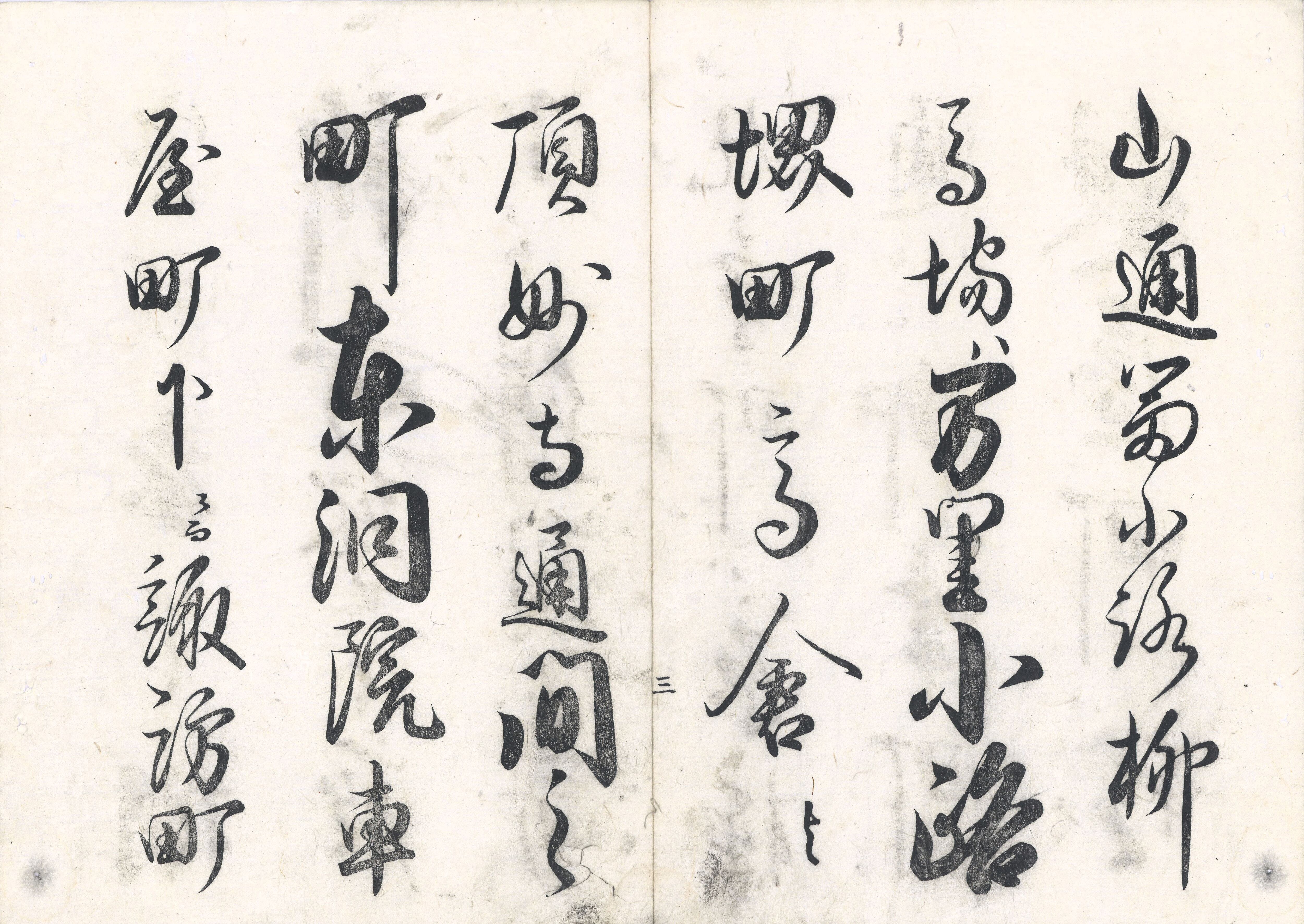 【備考】分類「往来物」。袋綴じ展開収録。『長雄京町尽〈并国尽〉[皇都町尽]』は、前半に寛政10年6月、耕元筆の「京町尽(皇都町尽)」、後半に寛政11年3月、数楽耕想筆の「国尽」を収録した長雄流手本。うち前者は流布本『京町尽』とは異本で、「建仁寺町・北縄手・大和大路・宮川町・伏見海道・骨屋町・大黒町・森下町・鞘町・問屋町…」と起筆して京都の町名を列挙する。後者は、五畿七道別に国名を列挙したもの。いずれも本文を大字・3行・無訓で記す。SE03240