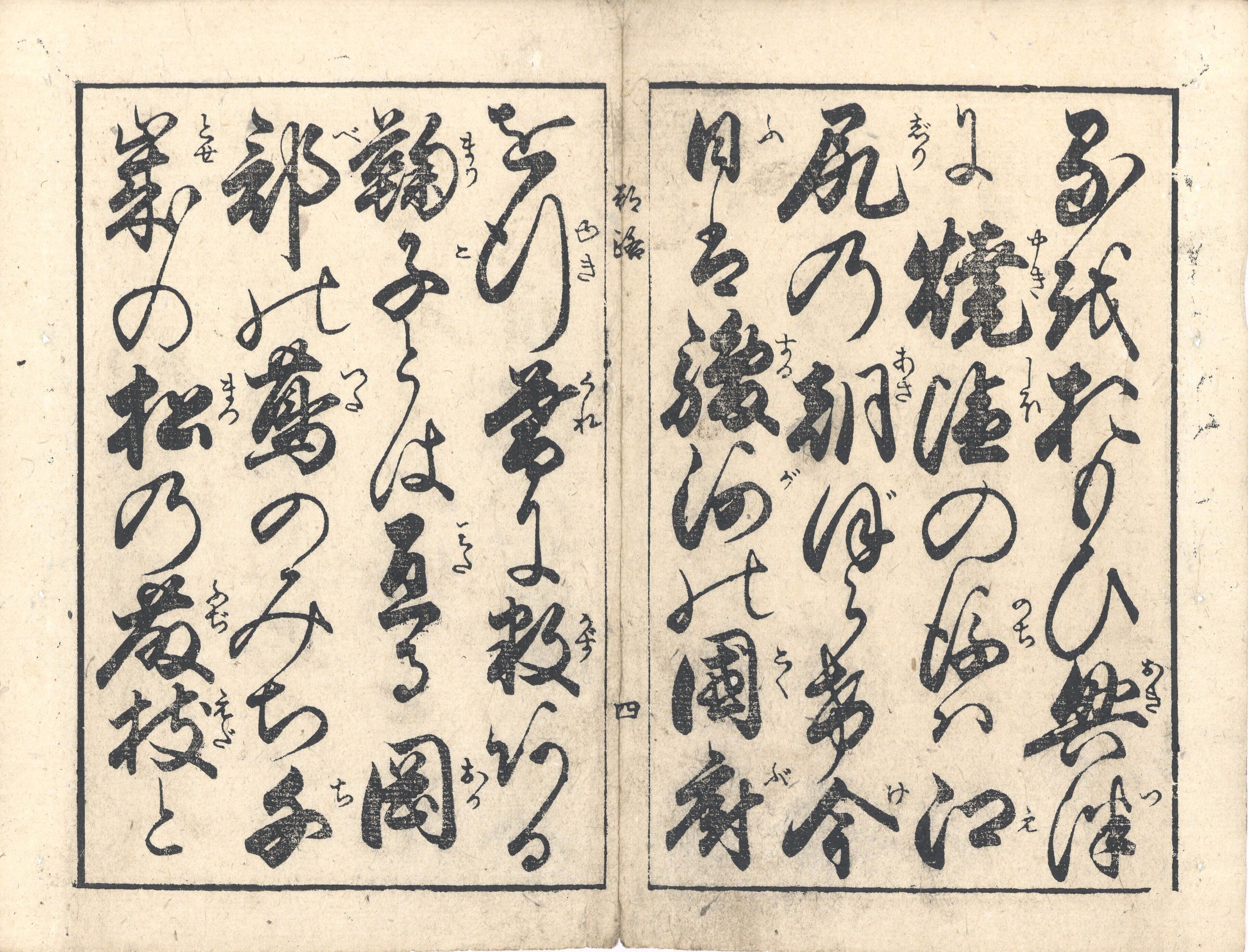 【備考】分類「往来物」。袋綴じ展開収録。山栖堂筆『都路往来[東海道往来]』は、『東海道往来』の本文を4行・付訓で記した往来物。本文は、「都路は、五十次余りに三つの宿、時得て咲や江戸の花、なみ静なる品川や、頓(ヤガ)て越来る河崎の、軒端(ノキバ)ならぶる神奈川は…」で始まる七五調・文字鎖の文章で東海道五十三次の宿駅名を列記し、最後に女文形式で「…花のにしきの九重に、こゝろうきたつ都ぞと、君の寿き祝ひたりけり。かしく」と結ぶ。SE03270