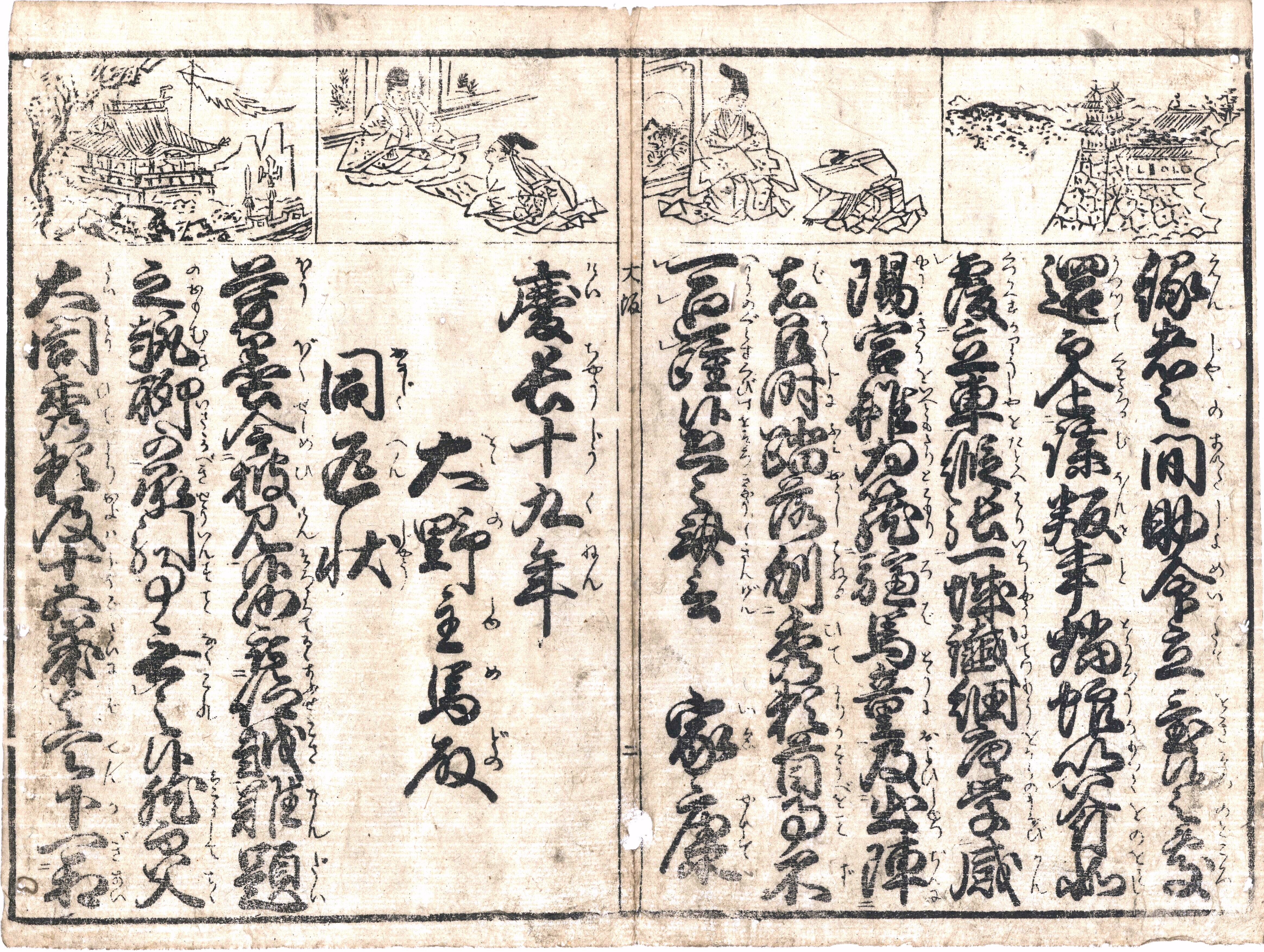【備考】分類「往来物」。袋綴じ展開収録。流布本『大坂状』の本文を大字・6行・付訓で記し、頭書に本文に関する挿絵を施した仙台板の往来物。『大坂状』は、大坂冬の陣の開戦にあたり、徳川家康が豊臣秀頼に送った挑戦状としての「大坂進状」と、秀頼から家康に宛てた受諾状としての「同返状」という2通の擬古状から成る往来。寛永2年1月書『古状揃』に含まれており、かなり早くから成立していた模様であるが、現存する初期刊本に江戸板が多いことから、あるいは江戸で先に出版されたものか。文中、「家康表裏侍」など、一見、当時としては不穏当な文言が見えるものの、草双紙の取り締まりが厳しくなる江戸後期に至っても引き続き同じ文句が載せられており注目される。SE03287