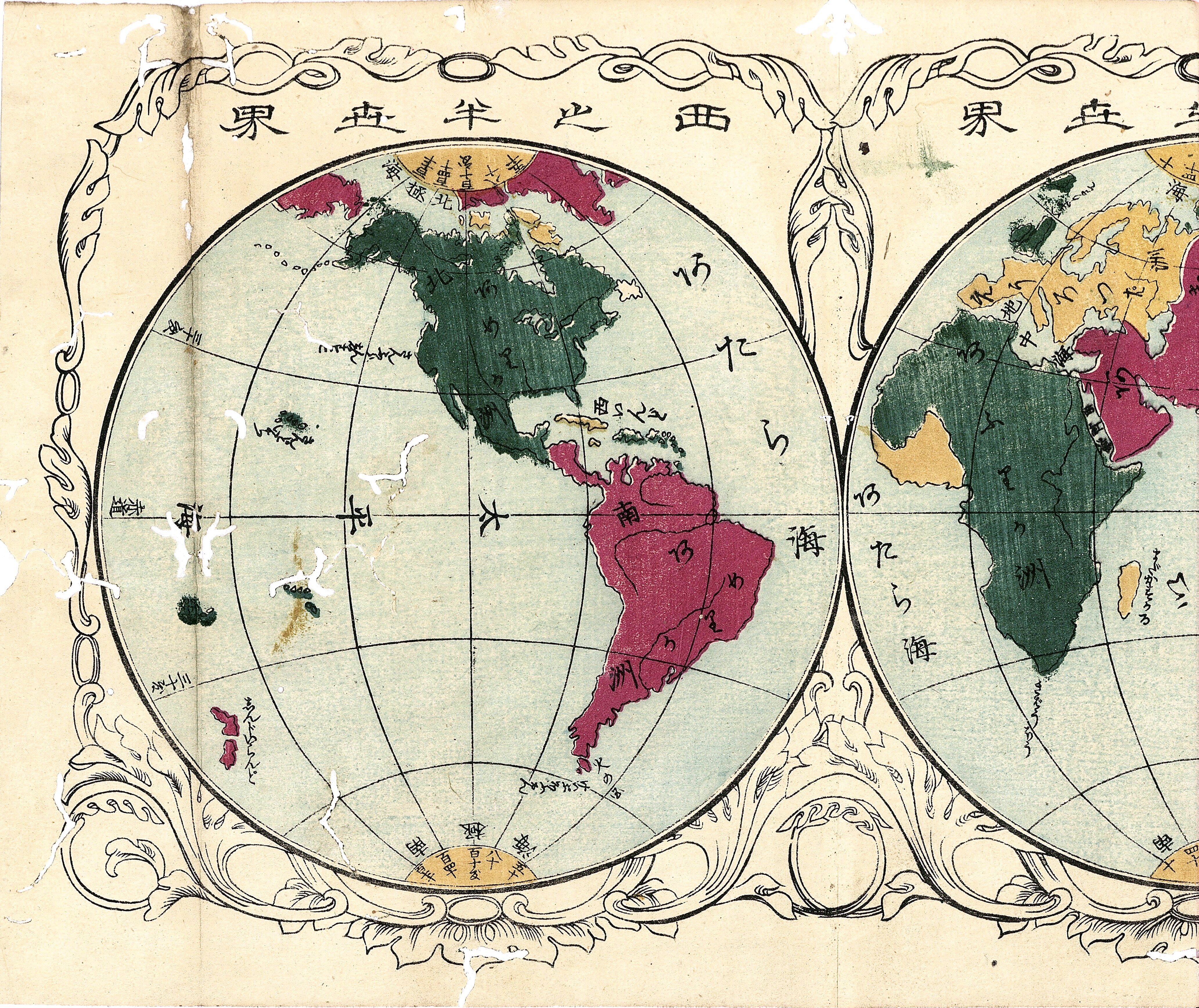 【備考】分類「往来物」。同板2種を全冊収録した(袋綴じ展開収録)。『〈習字〉改正商売往来』は、文体・文章・語彙ともに近世流布本『商売往来』とは全く異なる明治期新編『商売往来』。「開港以後の商法は、旧弊事件悉く、払ひ尽して一新し、会社を結び相助け、大事業おも最(いと)易く、成就すべきの時勢なり。先交易の品々は、山動植の諸品あり…」で始まる七五調の美文を大字・5行・付訓で綴る。内容も凡例の通り、商法会社・金石類・米穀野菜・家畜山海鳥獣・衣食器械・兵器類・薬種・海外旅商・山物類・植物類・動物類・工産物類・家什諸具・医術器械・暦法大意など、新語・新知識を満載したものとなっている。巻頭に、色刷り口絵「東之半世界・西之半世界」図を掲げる。SE03294