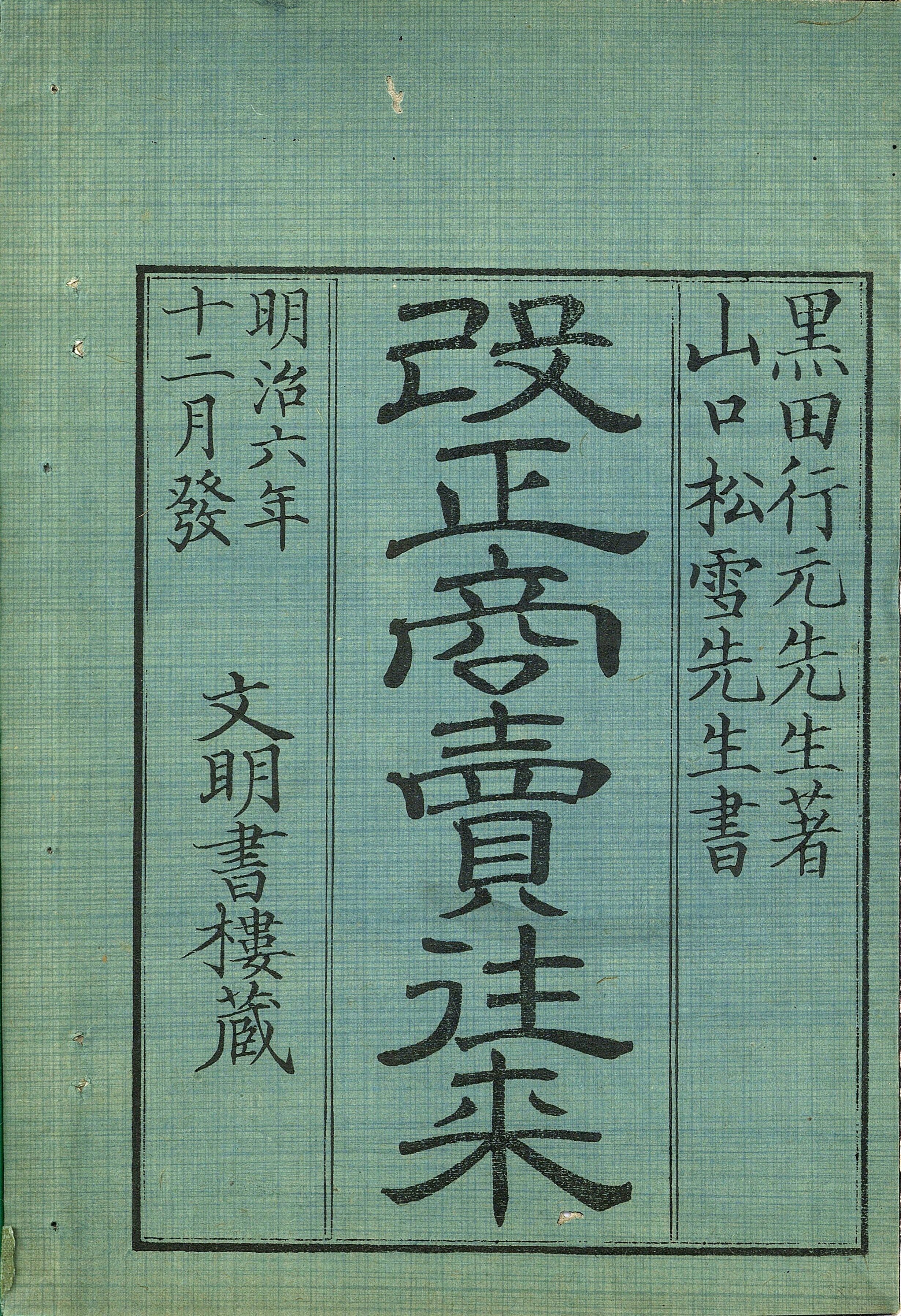 【年代等】明治6年7月自序。明治6年9月官許。明治6年12月刊。[京都]石田忠兵衛(文明書楼)板。