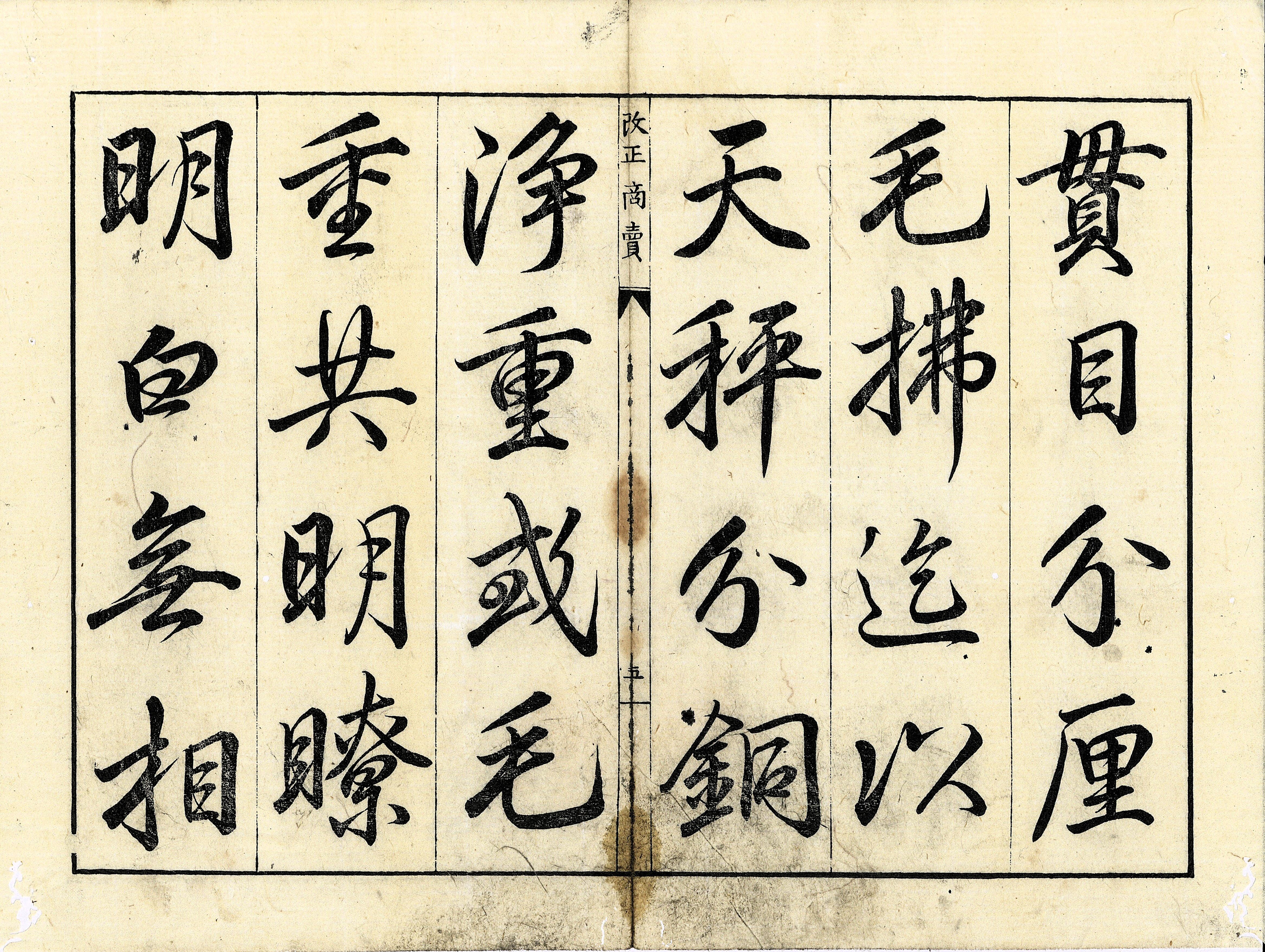 【備考】分類「往来物」。袋綴じ展開収録。『〈改正〉商売往来』は、近世流布本『商売往来』の改編版の一つ。近世流布本に新語や当時の通用語などを増補した往来。「大凡、商法、売買、取扱文字、員数、取遣、受送、日記、日誌、日嘉恵(控え)、大宝恵(覚え)、手控、証文、券書、注文、請取…」で始まるように、適宜改めるが、文章の形式や流れは近世流布本と同様。なお、楷書版と行書版の二様あり、いずれも大字・3行・無訓で記し、巻末に楷書・やや小字・8行・付訓の本文を採録する。このうち、先に出版された楷書版の首題には『開明商売往来』とあり、行書版では『改正商売往来』と改められた。SE03308