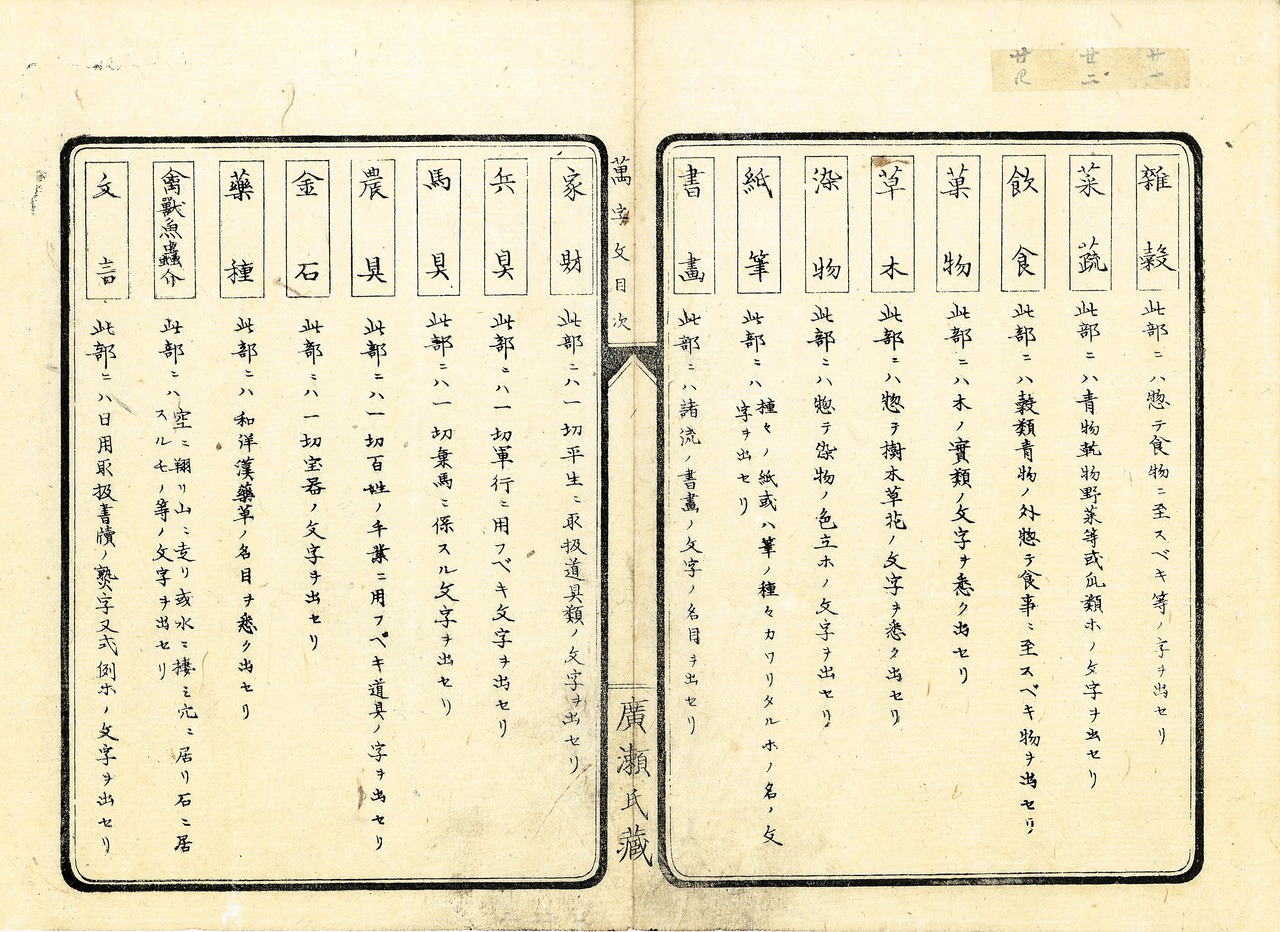 【備考】分類「往来物」。袋綴じ展開収録。『〈川上泊堂著輯〉商法万字文』は、主として商業従事者の教育用に編まれたもので、舶来品などの新語を含む日常語を多く集めた往来物。天文・地理・身体・疾病・人倫・度量衡数・家宅・雑穀・菜蔬・飲食・菓物・草木・染物・紙筆・書画・家財・兵具・馬具・農具・金石・薬種・禽獣魚虫介・文言の23項に分けて語彙を列挙する。「万字」と称するが、実際の収録語彙数は6705字。本文を行書・大字・5行・付訓で記す。SE03312