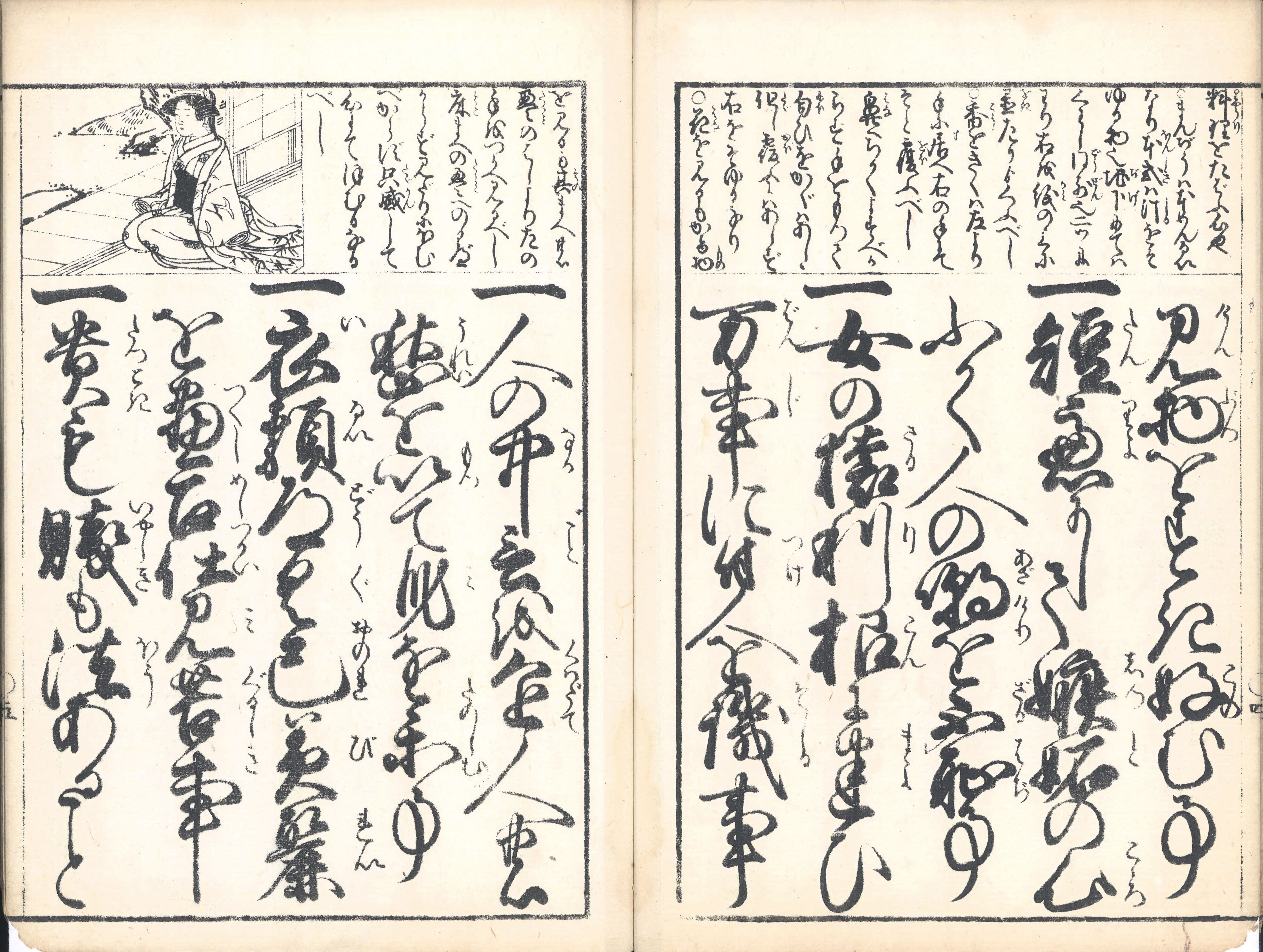 【備考】分類「往来物」。嘉永板と明治初年後印本の2種を全冊収録した。『〈婦人宝鑑〉女今川千金宝』は、沢田吉作、元禄板系統『女今川(新女今川)』本文を6行・付訓で記し、前付や頭書に種々の記事を載せた往来物。「〈女今川状・女手習状〉女教千金宝」の見返しは、寛政5年刊([江戸]須原屋伊八板)の同題の女子用往来の流用であり、嘉永板の本文・付録記事とは無関係。嘉永板には前付に「雨乞小町の図」「和国八勝景」を掲げ、頭書に「女平生たしなみ草」「七夕の由来・七夕和歌」「男女相性」「女中文封じやう」「目録・折紙の書様」を、また、後付に「小笠原折形式正之図」を載せる。元禄板系統『女今川』は、貞享板系統『女今川』の改編版で、各条々は貞享板とほぼ同傾向だが、後文については改編の跡が著しく、具体的には「心かだまし」と「心すなほ」の強調が目立つ。また、第5条では「主・親の深き恩」を「父母の深き恩」と言い換え、「忠孝」の代わりに「孝の道」とした点、さらに後文で、天地の道や五常を説いた抽象的な表現や、下僕や他人に対する心得などを割愛する一方、孝・貞の見地から己の心の善悪を内省することを説いた点に特色がある。SE03377